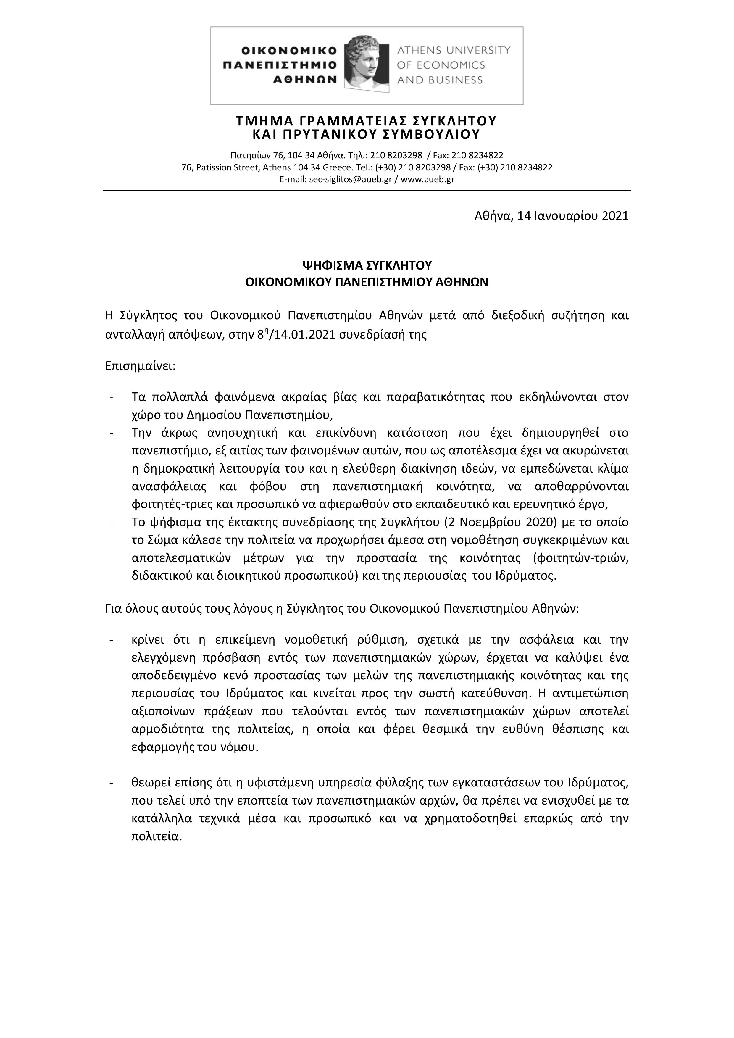 Σε ανακοίνωσή της, η Σύγκλητος, μας ενημερώνει ότι συμφωνεί με τα μέτρα που φέρνει η Κυβέρνηση στις σχολές σχετικά με το ζήτημα της πανεπιστημιακής αστυνομίας. Φαίνεται να δικαιώνεται, μάλιστα, αφού όπως η ίδια λέει, καλεί την πολιτεία εδώ και πολύ καιρό να «προχωρήσει στη νομοθέτηση συγκεκριμένων και αποτελεσματικών μέτρων». Βρήκε, μάλλον, ευκαιρία μπας και πάρει κάνα «κοκαλάκι» χρηματοδότησης σαν καλό σκυλί που είναι. Το μέτρο της πανεπιστημιακής αστυνομίας, αλλά και η στάση της Συγκλήτου, που «νίπτει τας χείρας της» για την παρουσία της αστυνομίας στο χώρο της σχολής (και ό,τι αυτή συνεπάγεται), θυμίζει μαύρες εποχές.