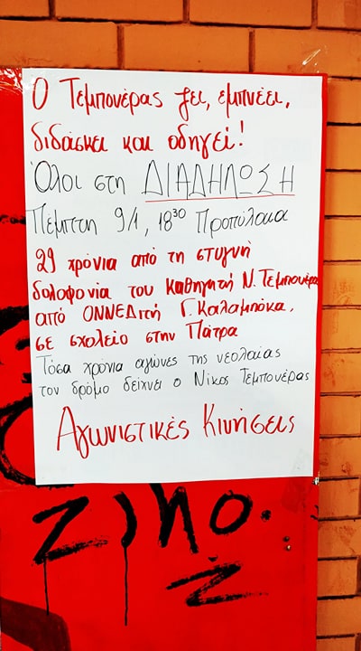 Φοιτητικό Κίνημα08 Ιαν 2020 ΑΘΗΝΑ | Κάλεσμα για τη διαδήλωση 29 χρόνια από τη δολοφονία του Ν. Τεμπονέρα
