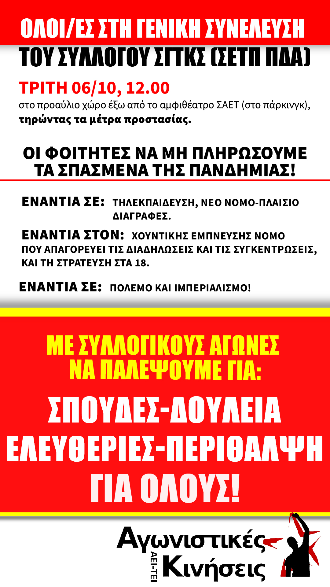 Όλα αυτά μπορούμε να τα απαντήσουμε μόνο με συλλογικό αγώνα, κόντρα στη λογική του ατομικού δρόμου που μια ζωή μας λέει το σύστημα ότι πρέπει να ακολουθήσουμε και που τα τηλεμαθήματα μας αναγκάζουν να ακολουθήσουμε. Για αυτό τον λόγο, θα πρέπει να βρεθούμε όλοι στη γενική συνέλευση του συλλόγου μας, την Τρίτη 6/10, 12:00, στον προαύλιο χώρο του αμφιθεάτρου ΣΑΕΤ, τηρώντας τα μέτρα προστασίας (μάσκες – αποστάσεις). Να πάρουμε αποφάσεις αγώνα, να διεκδικήσουμε το δικαίωμα μας στις ΣΠΟΥΔΕΣ-ΔΟΥΛΕΙΑ-ΕΛΕΥΘΕΡΙΕΣ-ΠΕΡΙΘΑΛΨΗ για όλους.