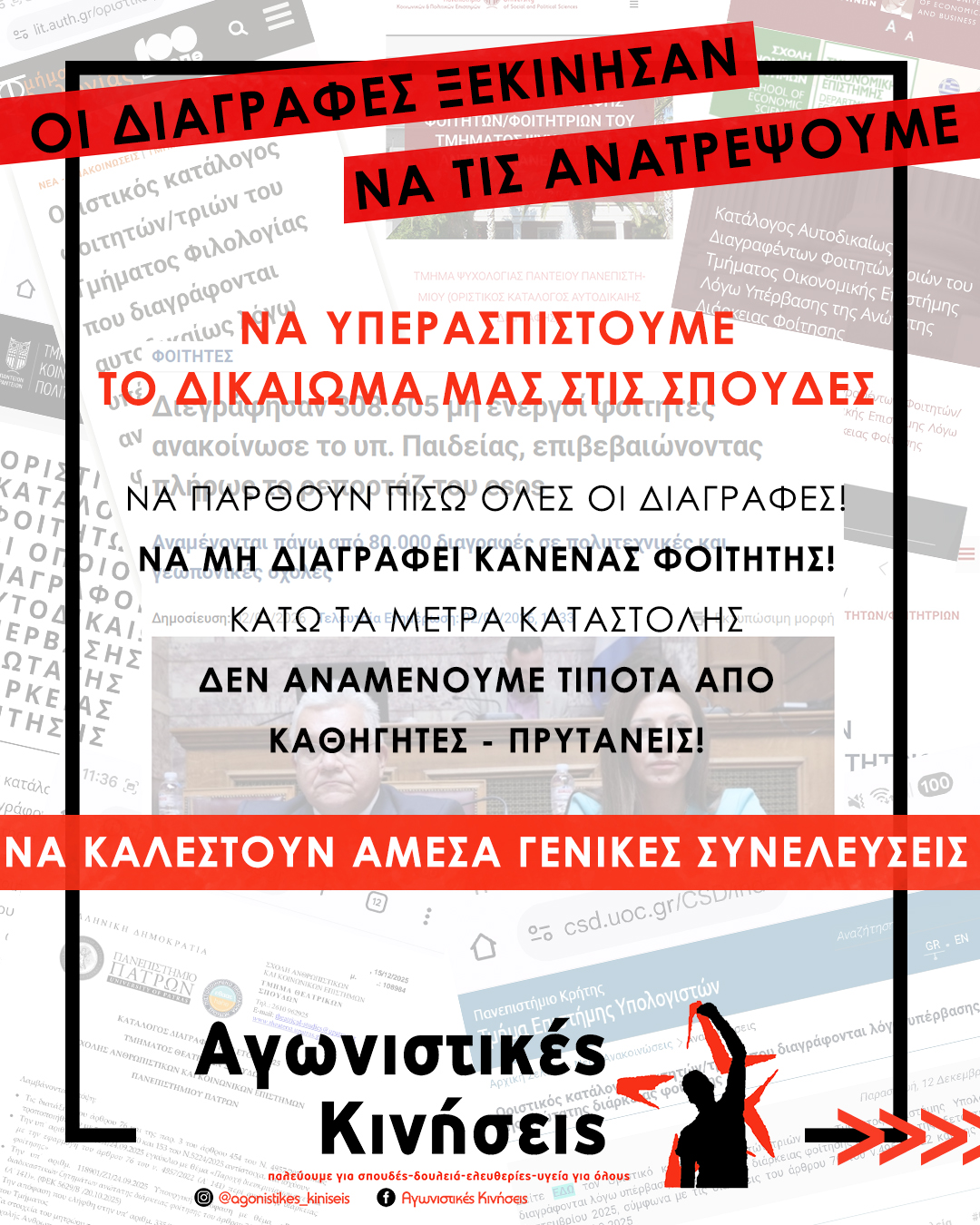 Οι πρώτες διαγραφές δεν είναι πια απειλή 391 διαγραμμένοι φοιτητές από το πανεπιστήμιο Κρήτης! Ξεσηκωμός για ΝΑ ΠΑΡΘΟΥΝ ΠΙΣΩ ΟΙ ΔΙΑΓΡΑΦΕΣ! ΟΛΟΙ ΣΤΙΣ ΓΕΝΙΚΕΣ ΣΥΝΕΛΕΥΣΕΙΣ για να ανατρέψουμε την πολιτική που μας πετάει έξω από τις σχολές! 11 Δεκέμβρη...