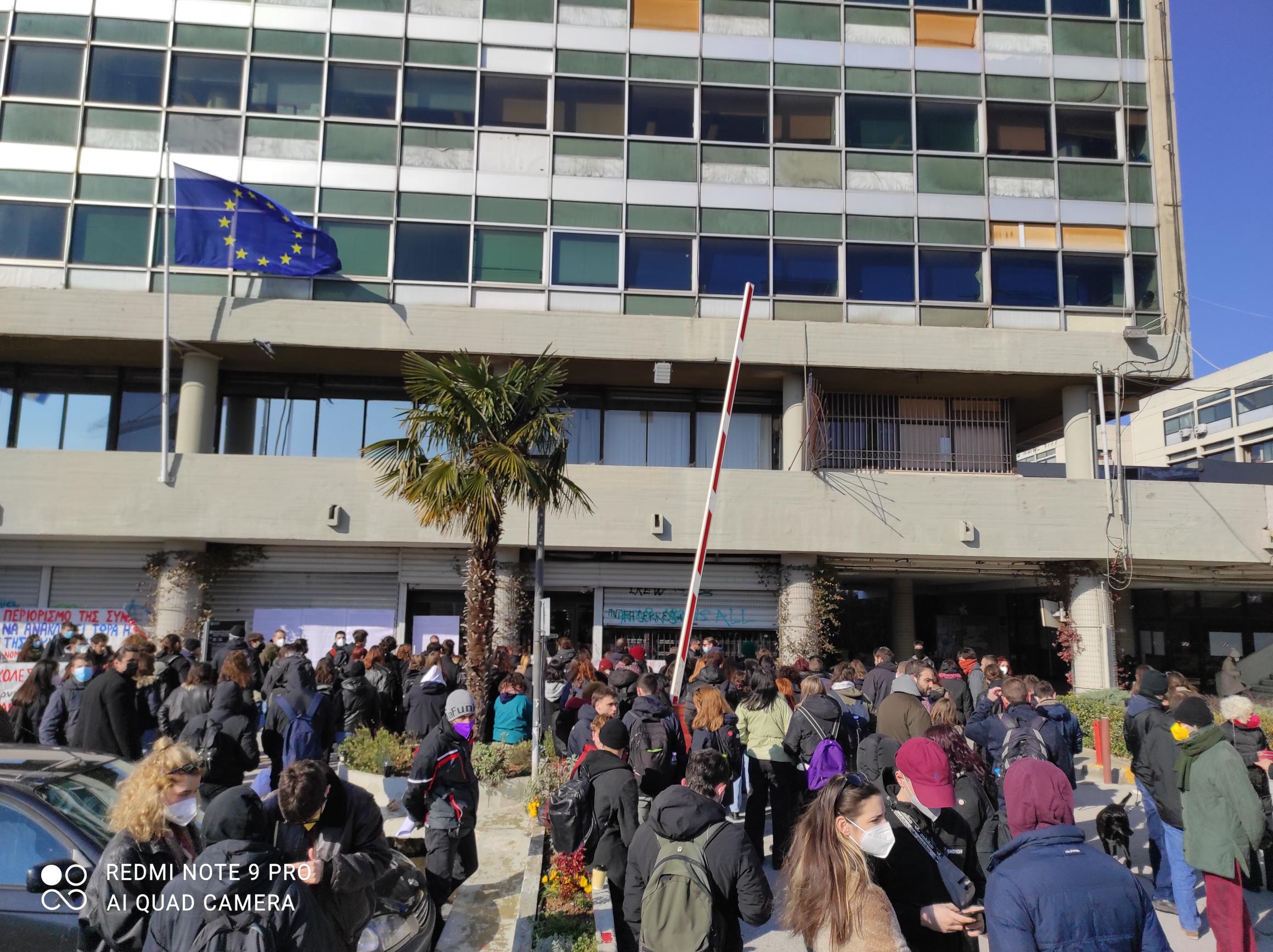 Σε αυτό το κλίμα όξυνσης της επίθεσης του συστήματος στα κεκτημένα του λαού και της νεολαίας, με συνεχείς μεθοδεύσεις για την εγκατάσταση της Πανεπιστημιακής Αστυνομίας, στη φάση εφαρμογής του νόμου 4777 και μεθόδευσης του νέου νόμου πλαίσιο , καλέστηκε με πρωτοβουλία των Αγωνιστικών Κινήσεων σύσκεψη με τις πολιτικές δυνάμεις της Αριστεράς . Κατόπιν συνεννόησης και μετά από παρεμβάσεις στη λέσχη , τη βιβλιοθήκη και τις σχολές , συγκροτήθηκε σήμερα συγκέντρωση έξω από το κτίριο της Πρυτανείας του ΑΠΘ , με τις περισσότερες πολιτικές δυνάμεις να συμμετέχουν , και κάποια πανό φοιτητικών συλλόγων . Η μαζικότητα ήταν αναντίστοιχη της έντασης της επίθεσης , με περίπου 150 φοιτητές . Ακούστηκαν συνθήματα ενάντια στην ΟΠΠΙ , την αστυνομία στις σχολές , την καταπάτηση του Ασύλου , την φασιστικοποίηση και τους νόμους Κεραμέως , και τέλος συγκροτήθηκε εκ νέου σύσκεψη για να δει επόμενες κινήσεις .