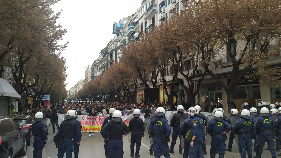 Καταγγέλλουμε την βάναυση καταστολή που δέχτηκε ο λαός της Θεσσαλονίκης τη 17η Νοέμβρη που συγκεντρώθηκε το μεσημέρι στη συμβολή Τσιμισκή και Αγίας Σοφίας για να τιμήσει την εξέγερση του Πολυτεχνείου. Οι μάσκες της κυβέρνησης έπεσαν. Ενώ η διαδήλωση ξεκίνησε τηρώντας τις αποστάσεις και όλα τα μέτρα υγειονομικής προστασίας, μέσα σε λίγα λεπτά, οι δυνάμεις καταστολής (ΜΑΤ, ΟΚΠΕ, ΔΕΛΤΑ) έστησαν έναν ασφυκτικό κλοιό γύρω από τους διαδηλωτές εξωθώντας το συγκεντρωμένο πλήθος να ποδοπατηθεί και να συνωστιστεί ασφυκτικά χωρίς οδό διαφυγής σε μία πρωτοφανή επιχείρηση τρομοκράτησης που διήρκησε περίπου 2 ώρες. Η επιχείρηση καταστολής της κυβέρνησης εξέθεσε με τη βία στον ιό εκατοντάδες εργαζόμενους, άνεργους, μέλη σωματείων και πολιτικών οργανώσεων στη Θεσσαλονίκη σε μία πρωτοφανή προσπάθεια τρομοκράτησης και καταπάτησης κάθε δημοκρατικού δικαιώματος. Εκατοντάδες αστυνομικοί και δεκάδες μέλη της ασφάλειας ξεκίνησαν να προκαλούν ένταση, να αρπάζουν διαδηλωτές μέσα από τη συγκέντρωση, να επιβάλλουν πρόστιμα, να χτυπούν. Πραγματοποιήθηκαν συνολικά έξι συλλήψεις κατά τη διάρκεια της κινητοποίησης, μεταξύ των οποίων και συναγωνιστής των Αγωνιστικών Κινήσεων, με ανυπόστατες κατηγορίες.