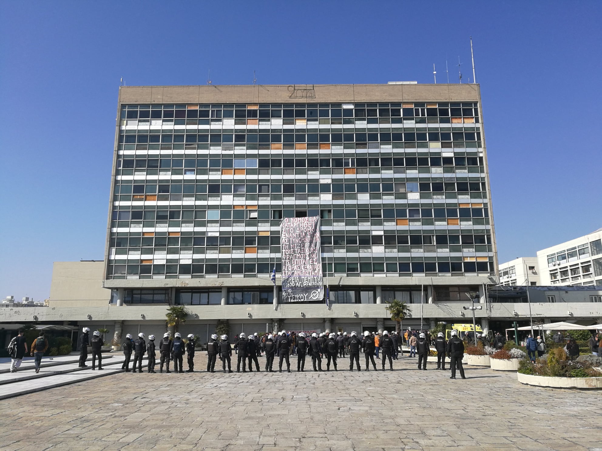 Δεκάδες άνδρες των ΜΑΤ έχουν εισβάλει μέσα στο χώρο της Πρυτανείας του ΑΠΘ και συλλαμβάνουν φοιτητές, που είχαν προχωρήσει σε κατάληψη του κτηρίου σήμερα το πρωί. Με εντολή της Πρυτανείας πραγματοποιείται άλλο ένα χτύπημα στο Λαϊκό Άσυλο Αγώνων και μας δίνουν εικόνες από το μέλλον που ετοιμάζουν για τα πανεπιστήμια. Λίγες μόνο μέρες μετά την ψήφιση του νόμου Κεραμέως που φέρνει Αστυνομία στους χώρους Ασύλου, υπάρχουν συλλήψεις και τρομοκράτηση φοιτητών.