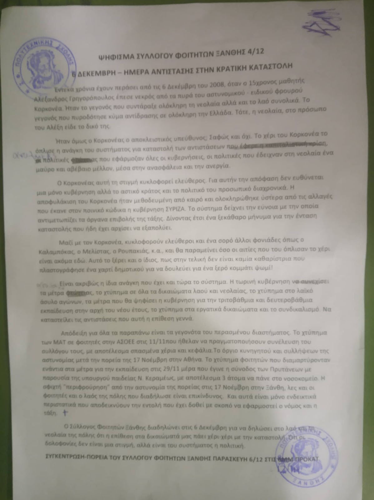 Σήμερα 6 Δεκέμβρη, ημέρα μνήμης της δολοφονίας του Α. Γρηγορόπουλου πραγματοποιήθηκε πρωινή πορεία 80 περίπου ατόμων που συγκροτήθηκε από τον Σύλλογο Φοιτητών Ξάνθης και τον Σύλλογο Οικοτρόφων.