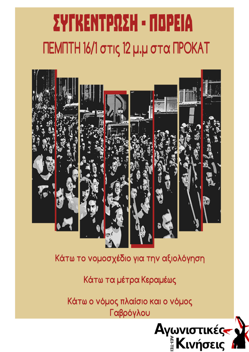 Φοιτητικό Κίνημα14 Ιαν 2020 ΞΑΝΘΗ | Κάλεσμα για Γενική Συνέλευση (15/1) και Κινητοποίηση (16/1) Οι Αγωνιστικές Κινήσεις καλούν σε συγκέντρωση - πορεία ενάντια στο νομοσχέδιο για την αξιολόγηση και τα νέα μέτρα Πέμπτη 16/1 στις 12 μ.μ στα Προκατ ΤΕΤΑΡΤΗ 15/1 ΣΥΝΕΛΕΥΣΗ ΣΥΛΛΟΓΟΥ στις 4 μ.μ στα ΠΡΟΚΑΤ