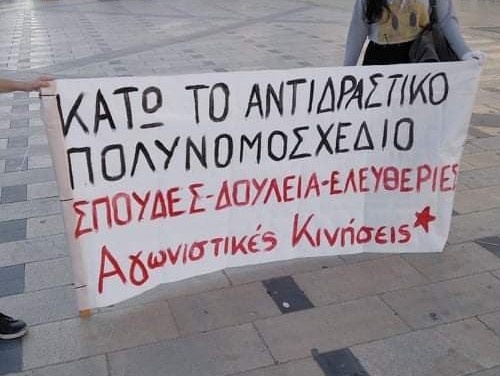 Πραγματοποιήθηκε στην Πάτρα η κινητοποίηση ενάντια στο πολυνομοσχέδιο για την εκπαίδευση με συγκέντρωση στην πλατεία Γεωργίου και πορεία ύστερα από κάλεσμα της ΕΛΜΕ. Συμμετείχαν με πανό η Α’ ΕΛΜΕ Αχαΐας, ο ΣΙΕΛ Αχαΐας, η Αγωνιστική Συσπείρωση Εκπαιδευτικών Αχαΐας, το Ελευθεριακό Σχήμα και οι φοιτητικοί σύλλογοι που είχαν πάρει αποφάσεις. Οι Αγωνιστικές Κινήσεις παρέμβηκαν με ξεχωριστό πανό και συνθήματα ενάντια στο νομοσχέδιο και τους ταξικούς φραγμούς.