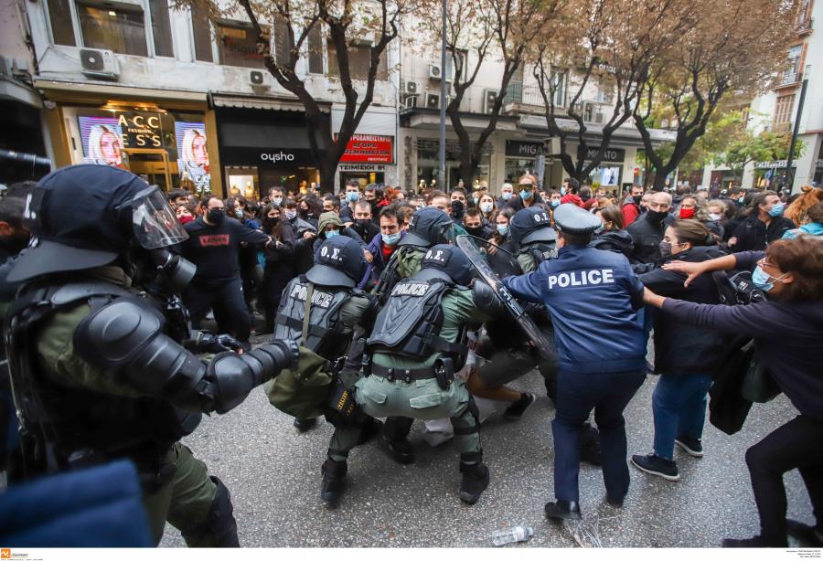 Καταγγέλλουμε την βάναυση καταστολή που δέχτηκε ο λαός της Θεσσαλονίκης τη 17η Νοέμβρη που συγκεντρώθηκε το μεσημέρι στη συμβολή Τσιμισκή και Αγίας Σοφίας για να τιμήσει την εξέγερση του Πολυτεχνείου. Οι μάσκες της κυβέρνησης έπεσαν. Ενώ η διαδήλωση ξεκίνησε τηρώντας τις αποστάσεις και όλα τα μέτρα υγειονομικής προστασίας, μέσα σε λίγα λεπτά, οι δυνάμεις καταστολής (ΜΑΤ, ΟΠΚΕ, ΔΕΛΤΑ) έστησαν έναν ασφυκτικό κλοιό γύρω από τους διαδηλωτές εξωθώντας το συγκεντρωμένο πλήθος να ποδοπατηθεί και να συνωστιστεί ασφυκτικά χωρίς οδό διαφυγής σε μία πρωτοφανή επιχείρηση τρομοκράτησης που διήρκησε περίπου 2 ώρες.
