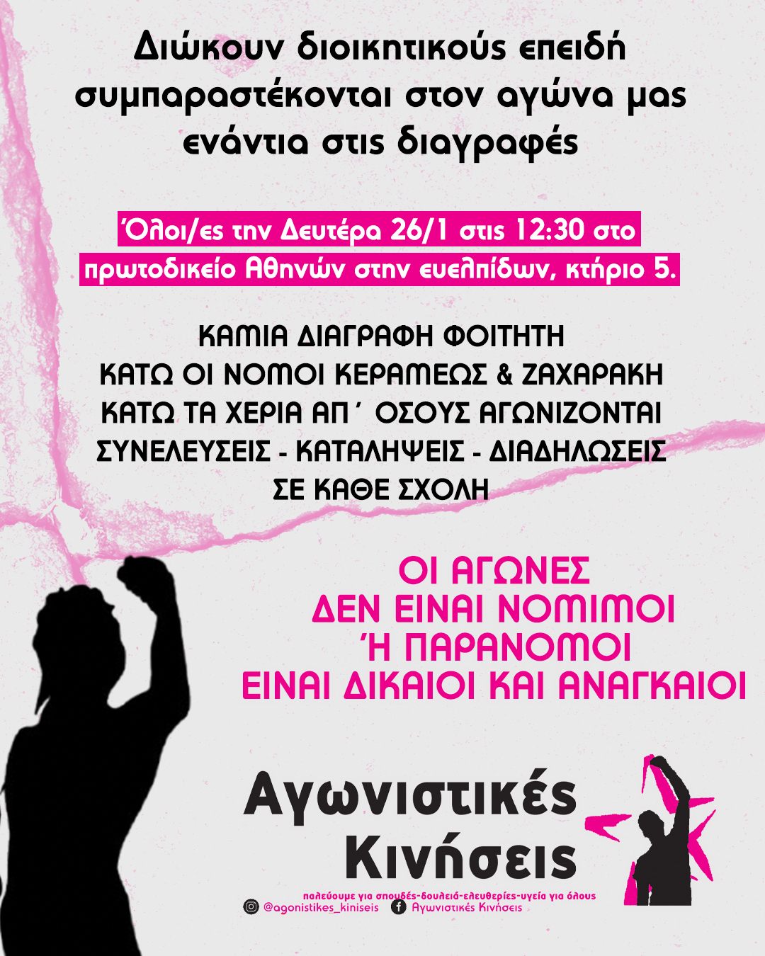 Μπροστά σε αυτή την προσπάθεια τρομοκράτησης, η θέση των φοιτητών είναι πλάι στους διοικητικούς που παίζουν τα κεφάλια τους ενάντια στις διαγραφές. Αλλά και μέσα στους συλλόγους μας, ώστε να πρωτοστατήσουμε στον αγώνα για την ανατροπή αυτών των νόμων που αμφισβητούν την ύπαρξη μας στις σχολές. Στεκόμαστε λοιπόν αλληλέγγυοι στους διοικητικούς που διώκονται επειδή αγωνίζονται, αναλαμβάνοντας ταυτόχρονα το καθήκον να είμαστε στην πρώτη γραμμή στη μάχη ενάντια στις διαγραφές και την καταστολή στα πανεπιστήμια.