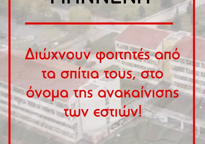 Πριν από μερικές ημέρες το τμήμα μέριμνας του πανεπιστημίου Ιωαννίνων έστειλε μέιλ σε εστιακούς φοιτητές ότι θα πρέπει να αφήσουν τα δωμάτιά τους μέχρι την Κυριακή 9/2, για να ξεκινήσουν εργασίες ανακαίνισης των κτηρίων του Α’ συγκροτήματος φοιτητικών εστιών. Όσοι φοιτητές οι οποίοι σύμφωνα με τον εσωτερικό κανονισμό των εστιών διαμένουν «νόμιμα» θα μεταφερθούν σε άλλο δωμάτιο, ενώ όσοι δεν υπακούν στον εσωτερικό κανονισμό ή έχει λήξει το συμβόλαιό τους και μένουν σε κατειλημμένα δωμάτια ουσιαστικά θα πεταχτούν εκτός των εστιών. Υποκριτικά μας λένε ότι θέλουν να αναβαθμίσουν τις συνθήκες διαβίωσής μας, ενώ στην πραγματικότητα μας πετάνε έξω από τα σπίτια μας και εφαρμόζουν τον αντιδραστικό εσωτερικό κανονισμό!
