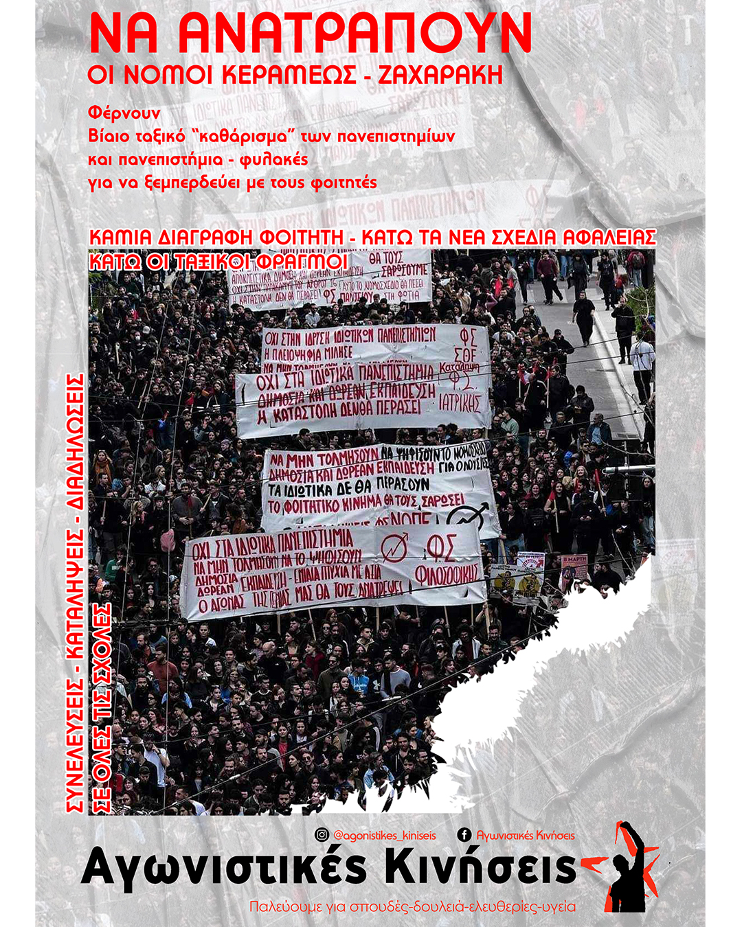 Οι φοιτητές οφείλουμε να βρεθούμε στην πρώτη γραμμή του αγώνα ενάντια στις διαγραφές και τα πειθαρχικά. Τώρα είναι η ώρα να μπούμε μαζικά στις συλλογικές μας διαδικασίες και να συζητήσουμε.Χωρίς αυταπάτες για έναν πιο εξομαλυμένο νόμο ή μια πιο ήπια εφαρμογή, να βγούμε μπροστά για την ανατροπή των νόμων που μας τσακίζουν τα δικαιώματα. Για να μην διαγραφεί κανένας φοιτητής, για Άσυλο αγώνων χωρίς κάμερες και τουρνικέ, για το δικαίωμα στην συλλογική και οργανωμένη πάλη χωρίς την πειθαρχική απειλή. Με επίγνωση των φίλων και των εχθρών , με εμπιστοσύνη στις δικές μας δυνάμεις. Με μαζικές Γενικές Συνελεύσεις και κινητοποιήσεις, διαδηλώσεις και καταλήψεις να βάλουμε φραγμό στην λαίλαπα που φέρνουν.