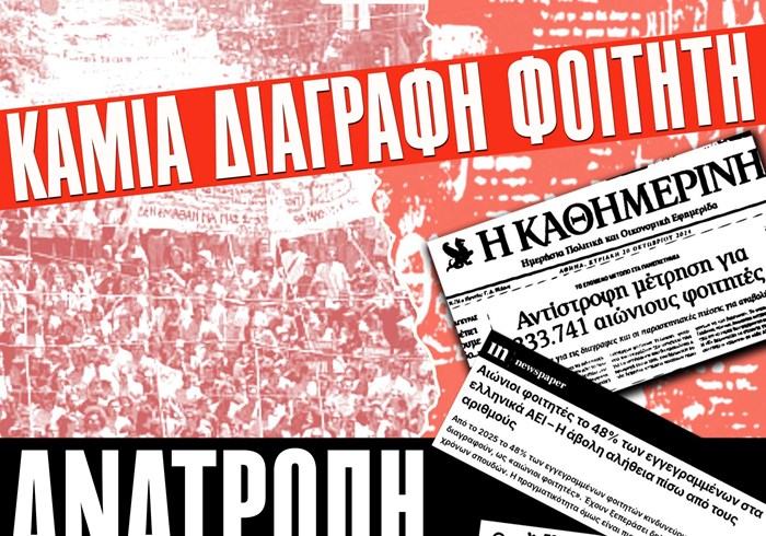 Ο μόνος τρόπος να τη «γλυτώσουμε» όμως, είναι η συγκρότηση φοιτητικού κινήματος που να πατάει στα πόδια του. Χωρίς αυταπάτες για καλούς πρυτάνεις και φιλολαϊκές κυβερνήσεις. Που να θέτει στο στόχαστρο συνολικά τον νόμο Κεραμέως και με αίτημα την ΑΝΑΤΡΟΠΗ του. Με συνελεύσεις και κινητοποιήσεις σε κάθε σύλλογο. Μόνο έτσι θα εξασφαλίσουμε ότι κανένας μας δεν θα διαγραφεί. Μόνο έτσι θα κερδίσουμε το οξυγόνο μας. Οι μεγαλειώδεις κινητοποιήσεις του προηγούμενου διαστήματος πρέπει να συνεχιστούν. Να παλέψουμε για δικαιώματα στη ζωή μας, στους χώρους που δουλεύουμε, που σπουδάζουμε, που υπάρχουμε καθημερινά. Αυτή θα είναι η πραγματική «δικαίωση» για τα θύματα και η πραγματική ήττα για το σύστημα που δολοφονεί τις ζωές μας. Να μην αφήσουμε κανέναν να διοχετεύσει την οργή μας στα κοινοβουλευτικά τους παιχνίδια. Τα δικαιώματά μας κερδίζονται στους δρόμους!