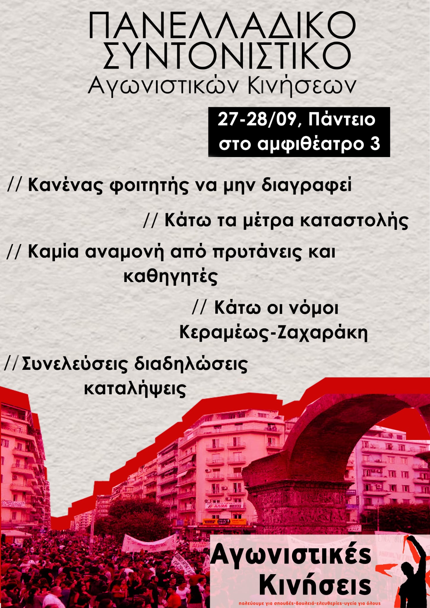 Συντονιστικό23 Σεπ 2025 Πανελλαδικό συντονιστικό Αγωνιστικών Κινήσεων | 27-28/9 2025 Πανελλαδικό συντονιστικό Αγωνιστικών Κινήσεων 27 & 28/9 Πάντειο, Αμφ. 3 Κανένας φοιτητής να μη διαγραφεί Κάτω τα μέτρα καταστολής Καμία αναμονή από Πρυτάνεις και καθηγητές Κάτω οι νόμοι Κεραμέως - Ζαχαράκη Συνελεύσεις - καταλήψεις - διαδηλώσεις