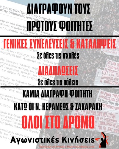 Οι διαγραφές όπως ήδη έχουμε περιγράψει θα αποτελέσουν τομή για την καθημερινότητά μας μέσα στη σχολές. Θα σημάνουν ακόμα περισσότερη εντατικοποίηση των σπουδών μας. Θα επικυρώσουν πως παιδιά από φτωχότερα λαϊκά στρώματα δεν θα μπορούν πλέον να σπουδάζουν, με το μαζικό ταξικό ξεσκαρτάρισμα που θα επιφέρουν. Θα εγκαθιδρύσουν τα πειθαρχικά ως πρώτη απάντηση ώστε να μην αντιδράμε στην επίθεση που δεχόμαστε.