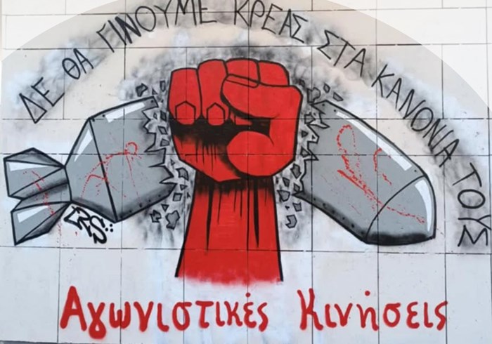 Δεν χωράνε τα δικαιώματά μας στο μαύρο μέλλον που μας ετοιμάζουν. Θέλουν να πειστούμε πως πρέπει να θυσιαστούμε για αυτούς. Αφαιμάζουν εμάς και τις οικογένειές μας στο όνομα της εθνικής ενότητας και ασφάλειας. Δεν είμαστε μαζί με αυτούς , δεν είμαστε ενωμένοι! Αυτοί εξαπολύουν επίθεση στη δουλειά, στις σπουδές, στη ζωή μας- εμείς βλέπουμε τα δικαιώματά μας να παίρνονται πίσω ένα ένα! Αυτοί δημιουργούν πολέμους για τα δικά τους συμφέροντα- εμάς στέλνουν να θυσιαστούμε! Μόνος φραγμός η πάλη μας! Όσα μας χωρίζουν με αυτούς, μας ενώνουν με τον εργαζόμενο λαό της χώρας μας και τους λαούς όλου του κόσμου.