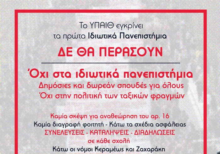 Δεν είναι τυχαία η πρεμούρα τους να δώσουν άδεια λειτουργίας στα πρώτα ιδιωτικά πανεπιστήμια από τώρα. Τα ιδιωτικά πανεπιστήμια πάνε χέρι – χέρι με την κατάργηση μιας σειράς δικαιωμάτων. Πάνε χέρι – χέρι με τις διαγραφές και τα σχέδια ασφάλειας. Πάνε χέρι – χέρι με την επικύρωση της συνθήκης της Μπολόνια. Θέλουν να συνηθίσουμε πως δε θα έχουμε δικαιώματα. Φυσικά προλειαίνουν και το έδαφος για τη δηλωμένη πρόθεση από πλευράς κυβέρνησης να αναθεωρήσει το άρθρο 16 του συντάγματος.