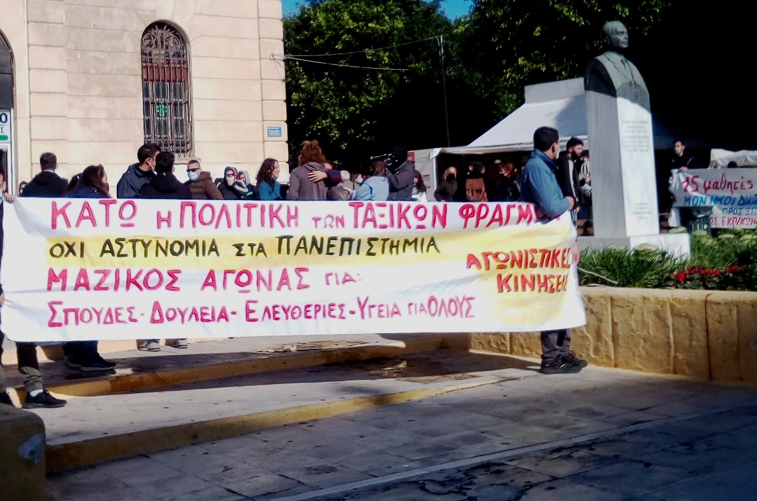 Κυριάρχησαν τα συνθήματα ενάντια στους νόμους Κεραμέως και τον φασιστικής έμπνευσης νόμο κατάργησης του λαϊκού ασύλου. Οι Αγωνιστικές Κινήσεις συμμετείχαν με διακριτό μπλοκ στη συγκέντρωση και την πορεία. Η σημερινή συγκέντρωση και πορεία μπορεί να είναι αναντίστοιχη της βαρβαρότητας των μέτρων Κεραμέως - Χρυσοχοϊδη και συνολικά της κυβέρνησης ενάντια στη νεολαία και τους εκπαιδευτικούς, φανέρωσε όμως διαθεσιμότητες ενός κόσμου, παρά την άγρια τρομοκρατία, και την ανάγκη να γίνουν συνελεύσεις στους χώρους σπουδών και δουλειάς για να πάρει μαζικά χαρακτηριστικά ο αγώνας. Ενάντια στους νέους ταξικούς φραγμούς και το γκρέμισμα ότι έχει απομείνει από τα δικαιώματα στη δουλειά, για το δικαίωμα στη διαδήλωση, την απεργία, τη συνέλευση και διεκδίκηση, για τη δωρεάν προστασία της υγείας και περίθαλψη για όλους.