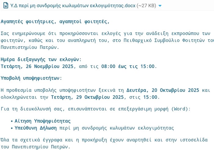 Πριν καν ολοκληρωθεί ο πρώτος μήνας μαθημάτων, το Πανεπιστήμιο Πατρών ανακοινώνει μέσω mail στους φοιτητές την συγκρότηση Πειθαρχικού Συμβουλίου με ηλεκτρονικές εκλογές. Στο Πειθαρχικό Συμβούλιο εκλέγεται ένας εκπρόσωπος των φοιτητών και ο αναπληρωτής του ως συνομιλητές με καθηγητές και πρυτάνεις, όπως αναγράφεται μέσα στον ν.Ζαχαράκη.
