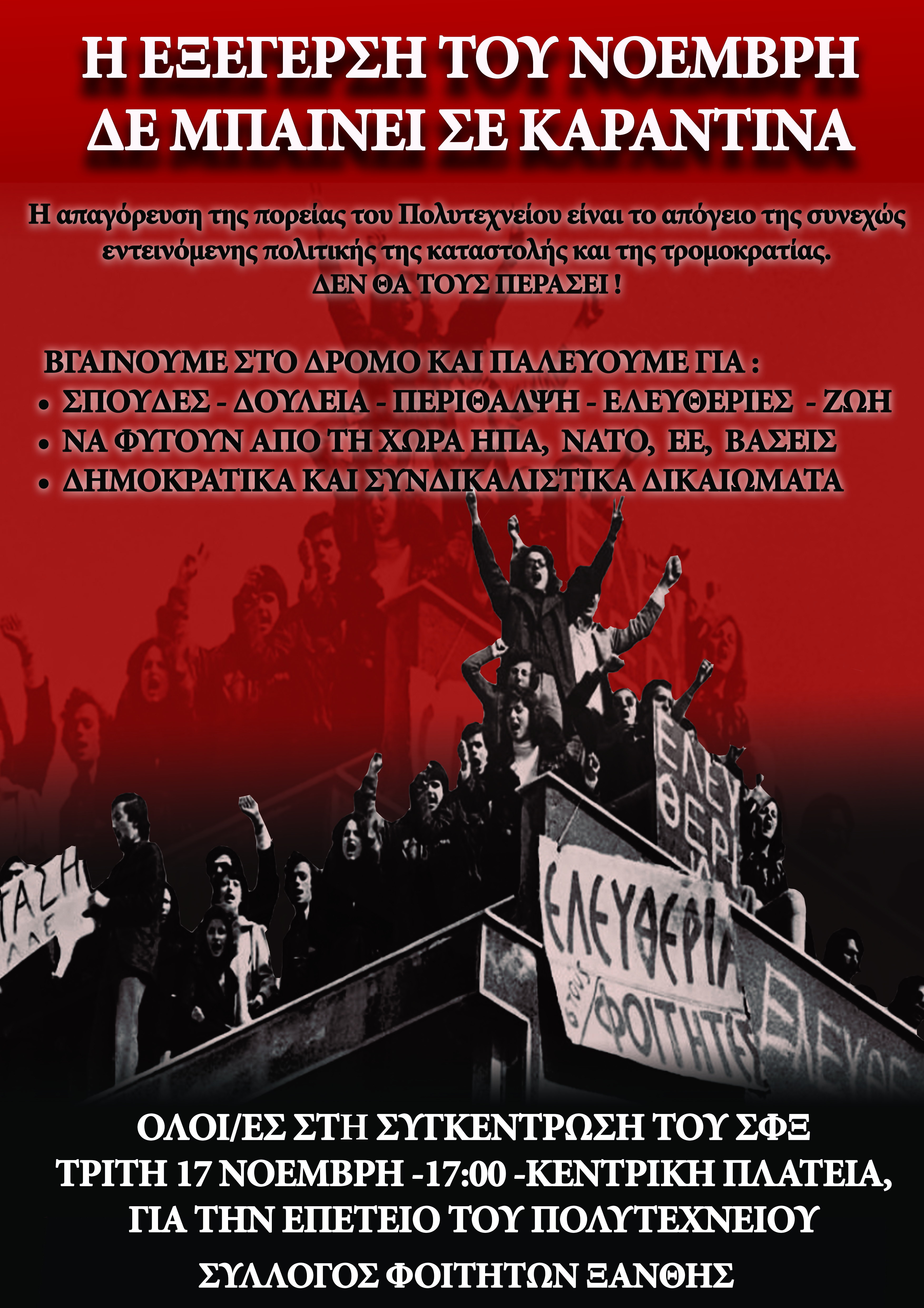 Ο Σύλλογος Φοιτητών Ξάνθης καλεί συγκέντρωση την Τρίτη 17/11 στην κεντρική πλατεία στις 17:00 ενόψει της επετείου του Πολυτεχνείου με σκοπό τη διεξαγωγή πορείας στους δρόμους της πόλης