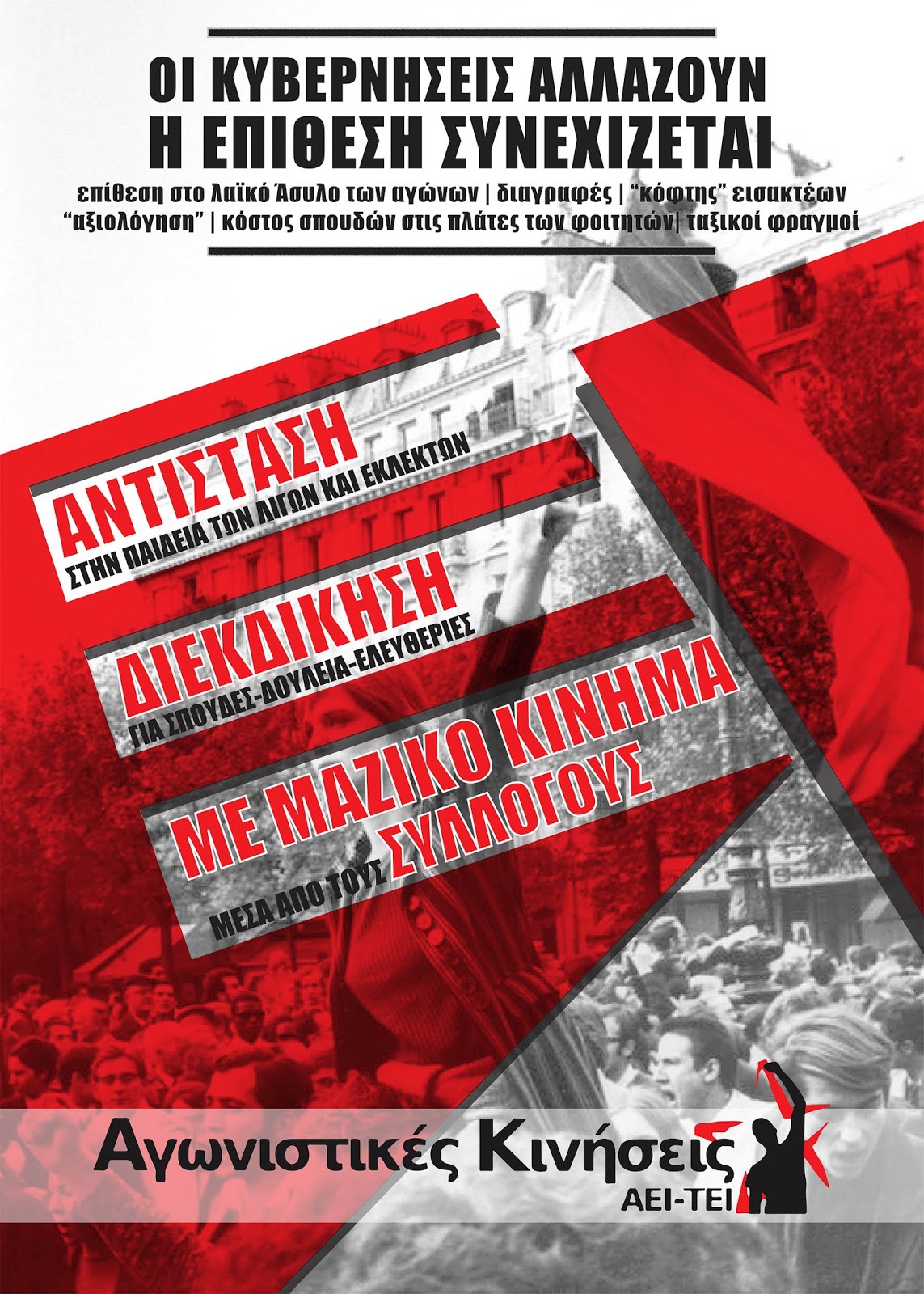 Είμαστε σε τροχιά διαμόρφωσης αυτού που χρόνια τώρα οι Αγωνιστικές Κινήσεις περιγράφουν ως «παιδεία των λίγων κι εκλεκτών». Σε εποχή μνημονίων και σκληρής επίθεσης ενάντια στο λαό, με το φ.κ. για χρόνια στον πάγο, ελευθερώνεται το έδαφος για τον αποκλεισμό όλο και περισσότερων παιδιών των λαϊκών στρωμάτων από την εκπαίδευση. Μια διαδικασία που ακόμη έχει μείνει πίσω σε σχέση με το ρυθμό που προχωράει η επίθεση έξω στην υπόλοιπη κοινωνία, με την έννοια ότι υπάρχουν ακόμα μεγάλα ποσοστά παιδιών από φτωχές οικογένειες που φτάνουν μέχρι τις ανώτερες βαθμίδες εκπαίδευσης. Εντούτοις, το ποσοστό αυτό απειλείται και το τοπίο χειροτερεύει δραματικά. Πάνε 4 χρόνια από την ψήφιση του Νόμου Διαμαντοπούλου (2011) σε συνθήκες 6 χρόνων μνημονίου. Λουκέτα σε σχολεία και σχολές, απανωτά χτυπήματα στους εκπαιδευτικούς, νέο λύκειο εξεταστικό κάτεργο, εφαρμογή νόμου πλαίσιο στα ΑΕΙ-ΤΕΙ, κατάργηση του Ασύλου. Αλλαγές στα προγράμματα σπουδών, διάλυση πτυχίων, δια βίου σεμινάρια, απάνθρωποι ρυθμοί σπουδών, σίτιση, εστίες, ηλεκτρονικά βιβλία, (ως και ηλεκτρονικές παρουσίες!). Η πρόσφατη αποσύνδεση της διδακτικής επάρκειας από το πτυχίο των καθηγητικών σχολών, ήταν ίσως το πιο σοβαρό χτύπημα των τελευταίων ετών στο ενιαίο πτυχίο. Αυτή η πορεία της επίθεσης θέλει να φτιάξει εκπαιδευτικά τοπία αντίστοιχα της ζούγκλας και της ερημοποίησης που επικρατεί στην αγορά εργασίας. Η αποβιομηχάνιση, τη μαζική αχρήστευση εργατικών χεριών και η εκτίναξη της ανεργίας στους νέους σε ανήκουστα ποσοστά (70%) αντιστοιχούν σε εκπαίδευση για πολύ «λιγότερους» και για πολύ «εκλεκτότερους».