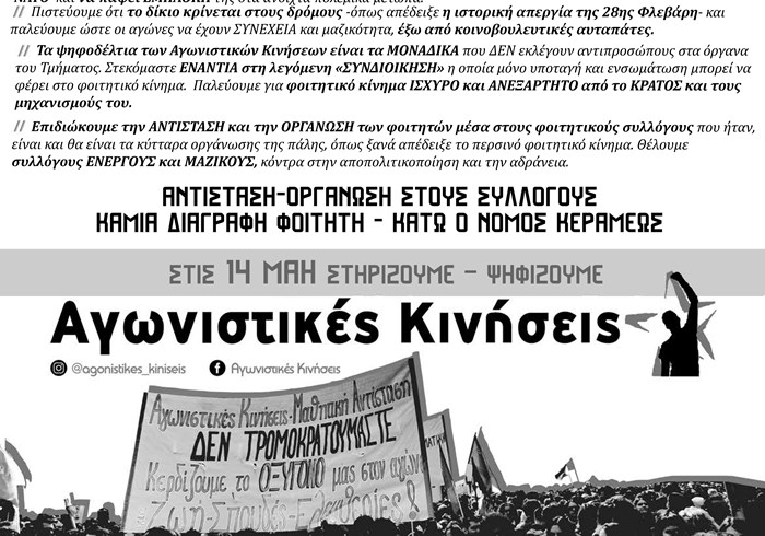 - Τα ψηφοδέλτια των Αγωνιστικών Κινήσεων είναι τα ΜΟΝΑΔΙΚΑ που ΔΕΝ εκλέγουν αντιπροσώπους στα όργανα του Τμήματος. Στεκόμαστε ΕΝΑΝΤΙΑ στη λεγόμενη «ΣΥΝΔΙΟΙΚΗΣΗ» η οποία μόνο υποταγή και ενσωμάτωση μπορεί να φέρει στο φοιτητικό κίνημα. Παλεύουμε για φοιτητικό κίνημα ΙΣΧΥΡΟ και ΑΝΕΞΑΡΤΗΤΟ από το ΚΡΑΤΟΣ και τους μηχανισμούς του.