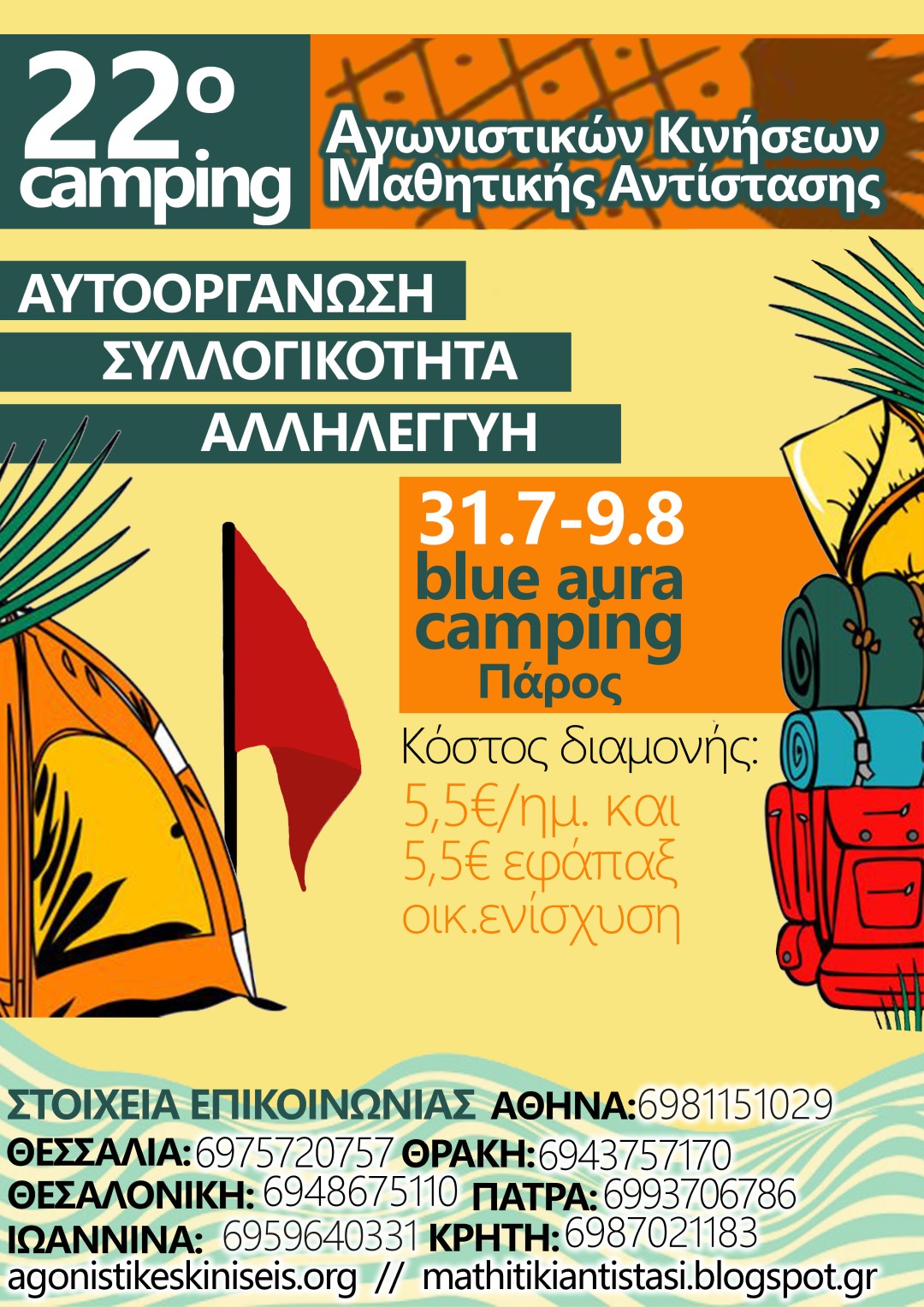 Μέσα σε αυτά τα πλαίσια, λοιπόν, διοργανώνεται το 22ο Camping των Αγωνιστικών Κινήσεων και της Μαθητικής Αντίστασης στο Camping Blue Aura της Πάρου τις ημέρες 31/7 έως 9/8. Mαζί με το κομμάτι του απολογισμού της χρονιάς, της ανταλλαγής εικόνων και της πολιτικής προετοιμασίας της επόμενης χρονιάς (άλλωστε η επίθεση δεν παίρνει... άδεια διακοπών, επομένως είναι αναγκαία η πολιτική συγκρότηση και μέσα στο καλοκαίρι), το Camping αποτελεί μια δομικά διαφορετική μορφή διακοπών από τη συνηθισμένη. Ενώ μέσα στη χρονιά το σύστημα αναγκάζει τη νεολαία είτε σε ατελείωτες ώρες (και μέρες) δουλειάς είτε τη βυθίζει στην εντατικοποίηση και το συνεχές διάβασμα, τσαλαπατώντας τα δικαιώματα στον ελεύθερο χρόνο και την ξεκούραση, παράλληλα προωθεί έναν ατομικό, βολικό για αυτό τρόπο διακοπώ νεκτόνωσης, (για όσους λίγους, μπορούν) που ουσιαστικά την ωθεί να ξεχάσει προσωρινά τα προβλήματα της.