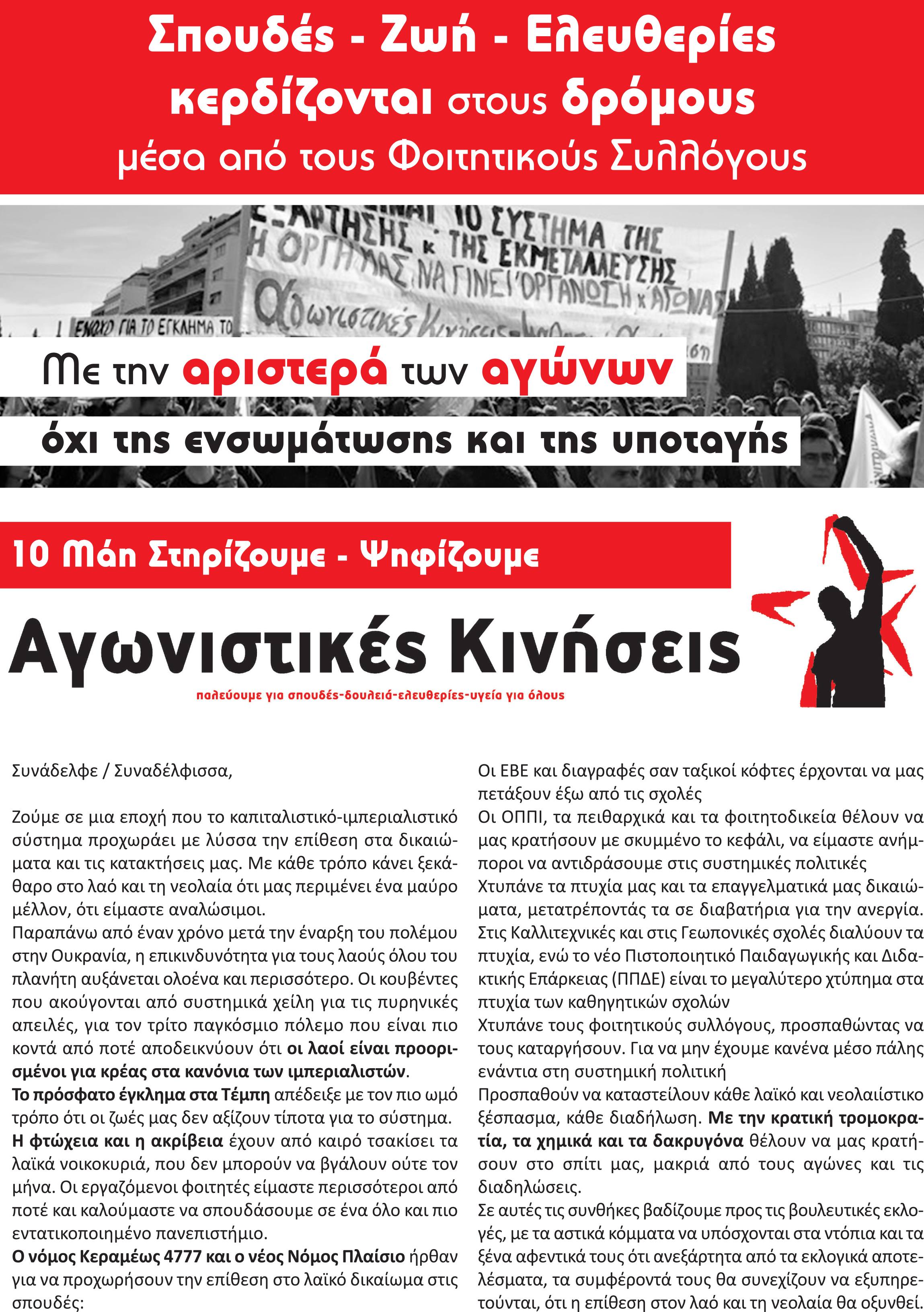 Φοιτητικές Εκλογές03 Μαϊ 2023 10 Μάη | Σπουδές-Ζωή-Ελευθερίες κερδίζονται στους δρόμους, οργάνωση αντίσταση στους συλλόγους (προεκλογικό τετρασέλιδο των αγωνιστικών κινήσεων) Κατεβάστε το τετρασέλιδο σε pdf