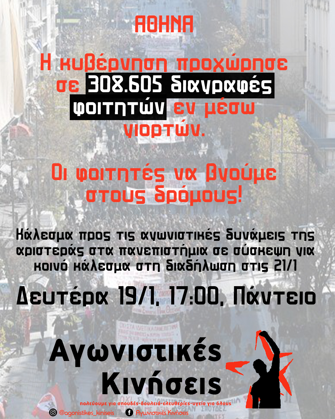 Η κυβέρνηση προχώρησε σε 308.605 διαγραφές φοιτητών εν μέσω γιορτών. Οι φοιτητές να βγούμε στους δρόμους!  Κάλεσμα προς τις αγωνιστικές δυνάμεις της αριστεράς στα πανεπιστήμια σε σύσκεψη για κοινό κάλεσμα στη διαδήλωση στις 21/1  Δευτέρα 19/1, 17:00,...