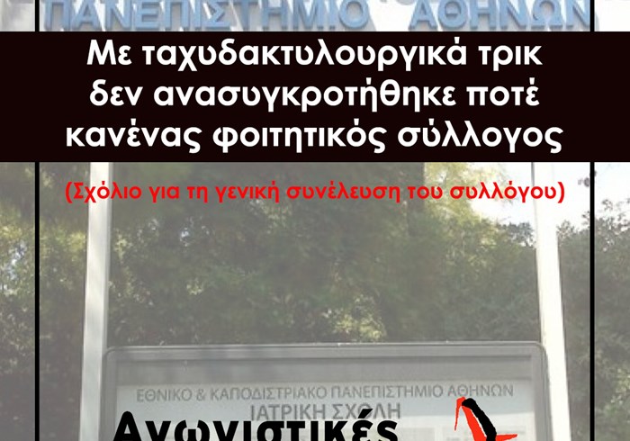 Σαν Αγωνιστικές Κινήσεις τονίσαμε και θα ξανατονίσουμε την ανάγκη πραγματοποίησης ακόμα πιο μαζικών γενικών συνελεύσεων, καταλήψεων και διαδηλώσεων. Αυτή την κατεύθυνση βάλαμε και μέσα στη γενική συνέλευση. Παιχνίδια όμως στις πλάτες των γενικών συνελεύσεων και των φοιτητικών συλλόγων δε θα παίξουμε. Γιατί η υπόθεση της ανασυγκρότησης του ΣΦΙΑ και του φοιτητικού κινήματος πανελλαδικά αφορά όλους τους φοιτητές. Και στη δική μας τουλάχιστον λογική ποτέ δεν ήταν να αποφασίζουμε για τους φοιτητές χωρίς τους φοιτητές.