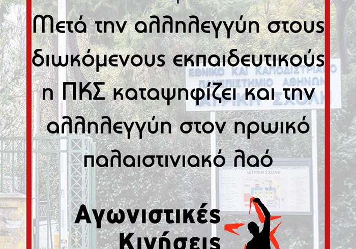 Η στάση της ΠΚΣ ταυτίστηκε με τη στάση των συστημικών δυνάμεων (ΔΑΠ και ΠΑΣΠ), που επικροτούν και χαιρετίζουν τις πολιτικές του κεφαλαίου και του ιμπεριαλισμού. Εννοείται και αυτές οι δυνάμεις καταψήφισαν χωρίς πολλά πολλά. Αλλά και αυτοί που θέλουν να παρουσιάζονται ως πρωτοπόροι των φοιτητικών συλλόγων, δε θέλουν διαδηλώσεις αλληλεγγύης στον παλαιστινιακό λαό.