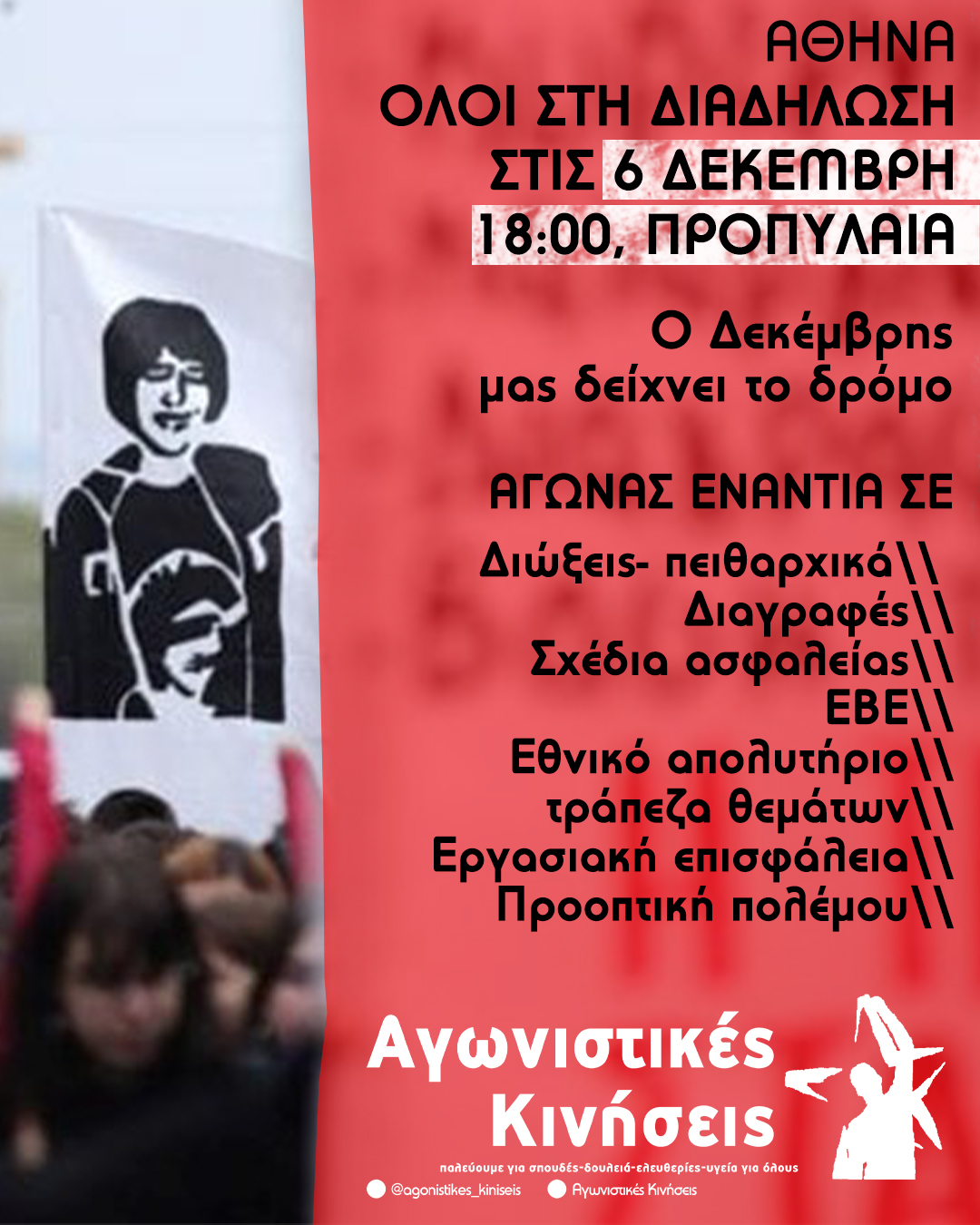 Η νεολαία αναζητά διέξοδο και θα την βρει στην μαζική οργανωμένη πάλη ενάντια στην φασιστικοποιηση της ζωής της. Όλοι στις διαδηλώσεις για την επέτειο της δολοφονίας του Α. Γρηγορόπουλου Σάββατο 6/12 στις 18:00 στα Προπύλαια.