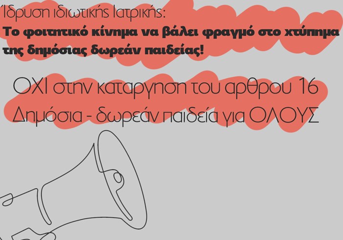 Να μπούμε σε μια τροχιά ανασυγκρότησης των φοιτητικών συλλόγων, μέσα από Γενικές Συνελεύσεις, καταλήψεις και διαδηλώσεις, ώστε να βάλουμε φραγμό στην ίδρυση των ιδιωτικών πανεπιστημίων και την κατάργηση του άρθρου 16!