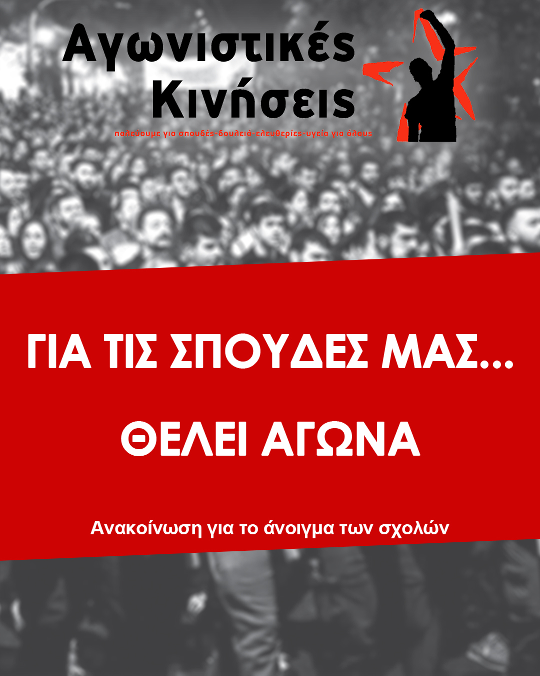 Εμείς από την άλλη θέλουμε σπουδές και ζωή με δικαιώματα! Όπως αυτοί, το σύστημα και οι κυβερνήσεις του μαζί με τους καθηγητές και τους πρυτάνεις, πολιτικά και οργανωμένα μας χτυπάνε, έτσι κι εμείς πολιτικά και οργανωμένα πρέπει να απαντήσουμε. Αυτή η απάντηση πρέπει να είναι συλλογική, όχι ο καθένας μόνος του όπως μας έχουν μάθει. Γι’ αυτό υπάρχουν οι φοιτητικοί μας σύλλογοι. Κάθε εγγεγραμμένος φοιτητής της σχολής ανήκει στον φοιτητικό σύλλογο που μαζί με το διοικητικό συμβούλιο και τις γενικές συνελεύσεις αποτελούν τα μόνα όργανα πάλης μας. Εκεί είναι το πεδίο στο οποίο μπορούμε να συζητήσουμε, να συνεννοηθούμε με τους συμφοιτητές μας και να βρούμε λύσεις στα κοινά μας προβλήματα. Μόνο μέσα από τη συλλογικότητα, την οργάνωση και τον αγώνα. Με συνελεύσεις, καταλήψεις και διαδηλώσεις, μπορούμε να δούμε καλύτερες μέρες!