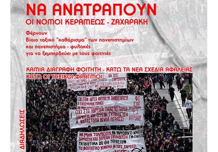 Οι φοιτητές οφείλουμε να βρεθούμε στην πρώτη γραμμή του αγώνα ενάντια στις διαγραφές και τα πειθαρχικά. Τώρα είναι η ώρα να μπούμε μαζικά στις συλλογικές μας διαδικασίες και να συζητήσουμε.Χωρίς αυταπάτες για έναν πιο εξομαλυμένο νόμο ή μια πιο ήπια εφαρμογή, να βγούμε μπροστά για την ανατροπή των νόμων που μας τσακίζουν τα δικαιώματα. Για να μην διαγραφεί κανένας φοιτητής, για Άσυλο αγώνων χωρίς κάμερες και τουρνικέ, για το δικαίωμα στην συλλογική και οργανωμένη πάλη χωρίς την πειθαρχική απειλή. Με επίγνωση των φίλων και των εχθρών , με εμπιστοσύνη στις δικές μας δυνάμεις. Με μαζικές Γενικές Συνελεύσεις και κινητοποιήσεις, διαδηλώσεις και καταλήψεις να βάλουμε φραγμό στην λαίλαπα που φέρνουν.