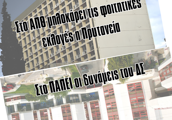 Καταγγέλλουμε την παρεμπόδιση της διεξαγωγής των φοιτητικών εκλογών στο ΠΑΠΕΙ από δυνάμεις του διοικητικού συμβουλίου. Σε μια περίοδο που Πρυτανείες εμποδίζουν την διεξαγωγή φοιτητών εκλογών σε διάφορες σχολές (π.χ. ΑΠΘ), βλέπουμε δυνάμεις να βάζουν εμπόδια στην ολοκλήρωση των απαραίτητων διαδικασιών (προεκλογικά ΔΣ, αντιπαραβολή ψηφοδελτίων) για την διεξαγωγή των φοιτητικών εκλογών. Στάσεις όπως η αποχώρηση των ΕΑΑΚ από το προεκλογικό ΔΣ της Δευτέρας, της ΚΝΕ/ΠΚΣ που καθυστερεί να εμφανιστεί και μπλοκάρει την διαδικασία με το να αντιπαρατίθεται με τις υπόλοιπες δυνάμεις για το που θα τοποθετηθούν οι κάλπες (όποιος κατάλαβε, κατάλαβε) δείχνουν την βαθιά ιδιοκτησιακή λογική που διακατέχει αυτές τις δυνάμεις.