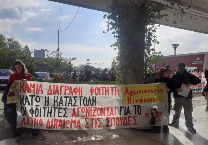 Κινητοποίηση φοιτητών πραγματοποιήθηκε σήμερα στην Πρυτανεία του ΑΠΘ ενάντια στις διαγραφές και τα νέα μέτρα καταστολής. Η κινητοποίηση καλέστηκε μέσα από αποφάσεις γενικών συνελεύσεων.