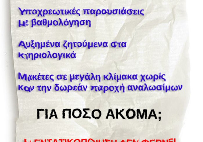 Είναι ουσιαστικό να συνειδητοποιήσουμε πως δεν ευθυνόμαστε εμείς για την πιεστική καθημερινότητα που ζούμε, πως δεν φταίμε εμείς αν δεν μπορούμε να τα βγάλουμε πέρα με τις υποχρεώσεις στην σχολή μας. Να μπούμε στην διαδικασία να αμφισβητήσουμε τους όρους με τους οποίους σπουδάζουμε, συλλογικά να δώσουμε την απάντηση. Στηρίζουμε τα συλλογικά μας όργανα, σπάμε την λογική του ‘’ ο καθένας μόνος του’’.