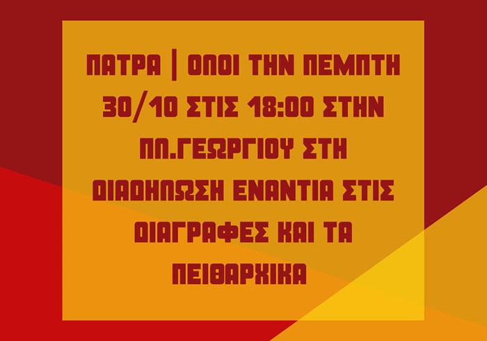 ΟΛΟΙ ΤΗΝ ΠΕΜΠΤΗ 30/10 ΣΤΙΣ 18:00 ΣΤΗΝ ΠΛ.ΓΕΩΡΓΙΟΥ ΣΤΗ ΔΙΑΔΗΛΩΣΗ ΕΝΑΝΤΙΑ ΣΤΙΣ ΔΙΑΓΡΑΦΕΣ ΚΑΙ ΤΑ ΠΕΙΘΑΡΧΙΚΑ