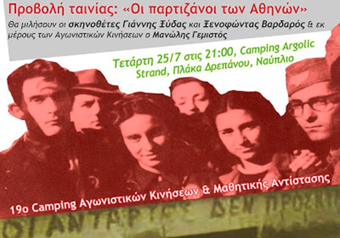 Προβολή της ταινίας: «Οι παρτιζάνοι των Αθηνών» και συζήτηση με τους σκηνοθέτες στο πλαίσιο του 19ου Camping Αγωνιστικών Κινήσεων & Μαθητικής Αντίστασης (Camping Argolic Strand, Πλάκα Δρεπάνου, Ναύπλιο) την Τετάρτη 25/7 στις 21:00.