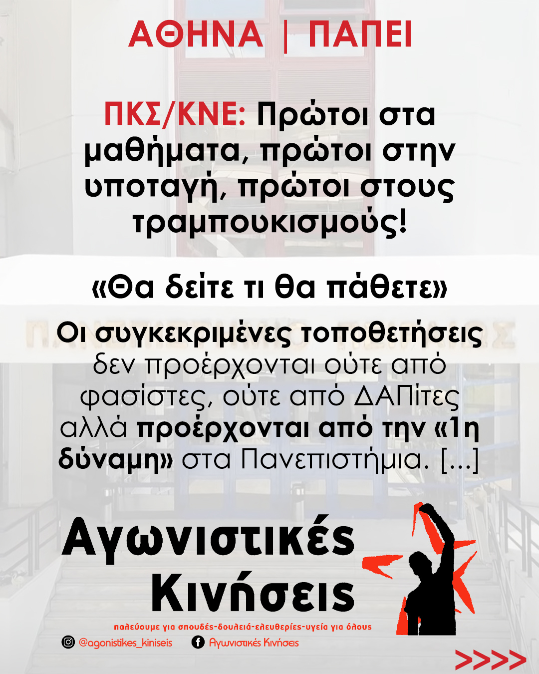 Τον τελευταίο καιρό διαπιστώνουμε ξανά, μέσα στις σχολές και στα σχολεία, την διαρκή εμφάνιση φασιστικών και ναζιστικών υλικών και συμπεριφορών. Από τα αυτοκόλλητα και τα συνθήματα στους τοίχους, το κάψιμο ή σκίσιμο υλικού αριστερών απόψεων, μέχρι...