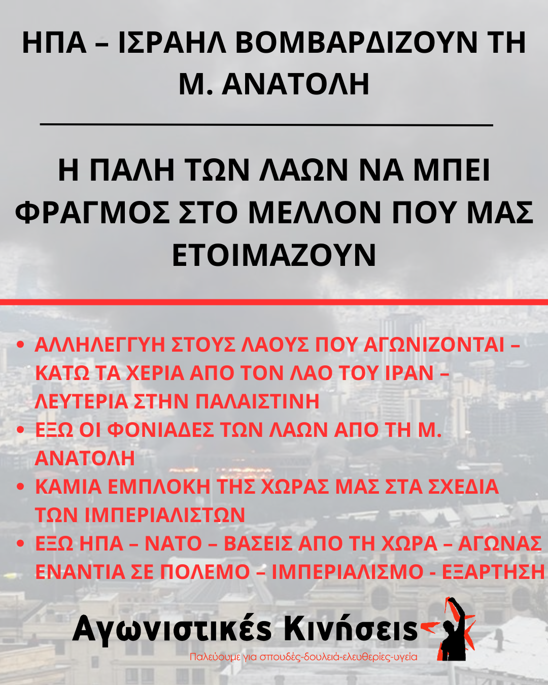 Ματώνουν ξανά τη Μ. Ανατολή…Στις 28/02 ΗΠΑ – Ισραήλ προχώρησαν σε πολεμική επιδρομή εναντίον του Ιράν. Η αιματηρή επίθεση αποτελείκορύφωση των απειλών όλου του προηγούμενου διαστήματος και συνέχεια της ολιγοήμερης αναμέτρησης τουπερσινού καλοκαιριού....