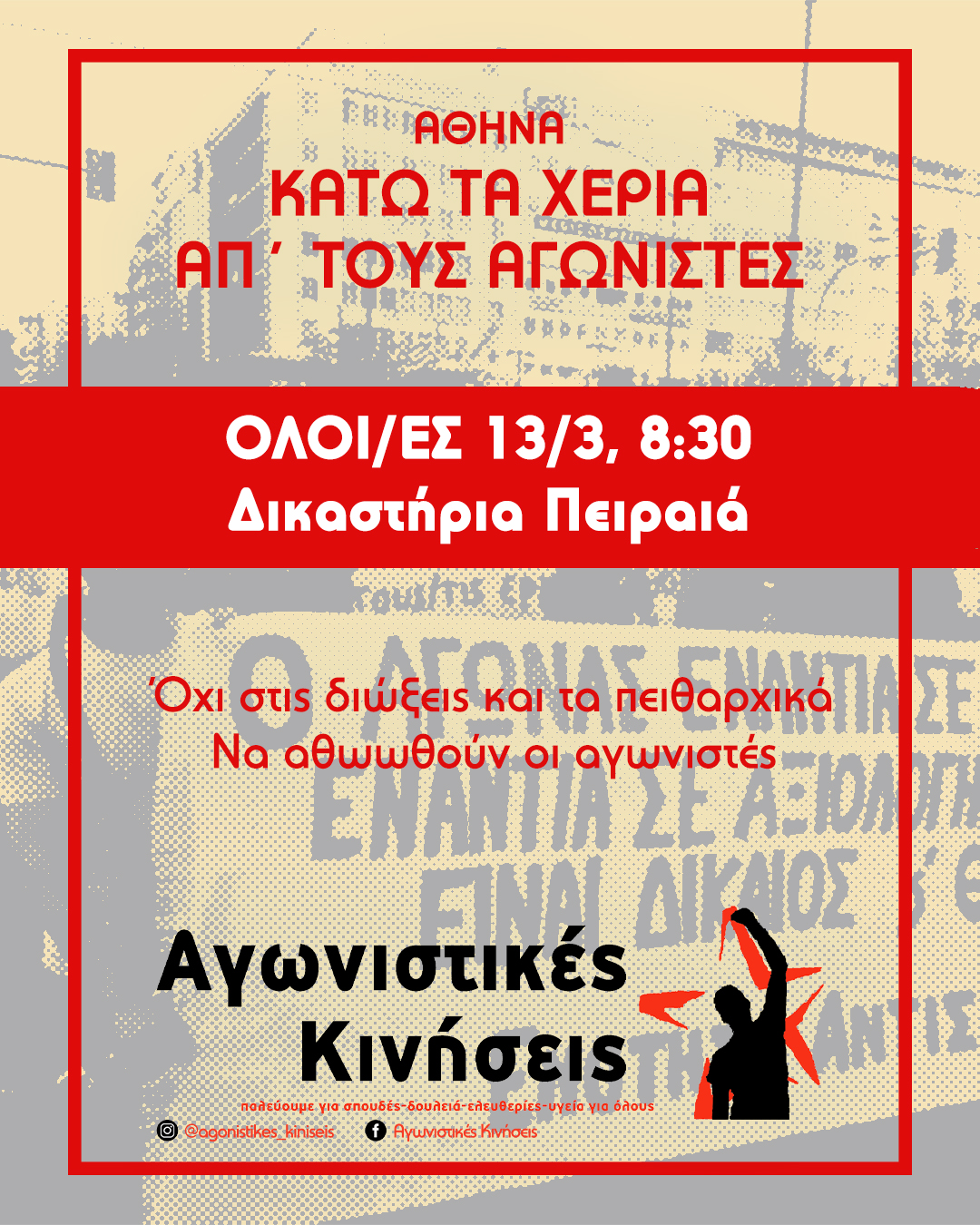 Κάτω τα χέρια απο την συνδικαλιστική δράση - Κάτω τα χέρια απ τους αγωνιστές | ΟΛΟΙ/ΕΣ, ΔΕΥΤΕΡΑ 23/3, 8:30, ΔΙΚΑΣΤΗΡΙΑ ΠΕΙΡΑΙΑ