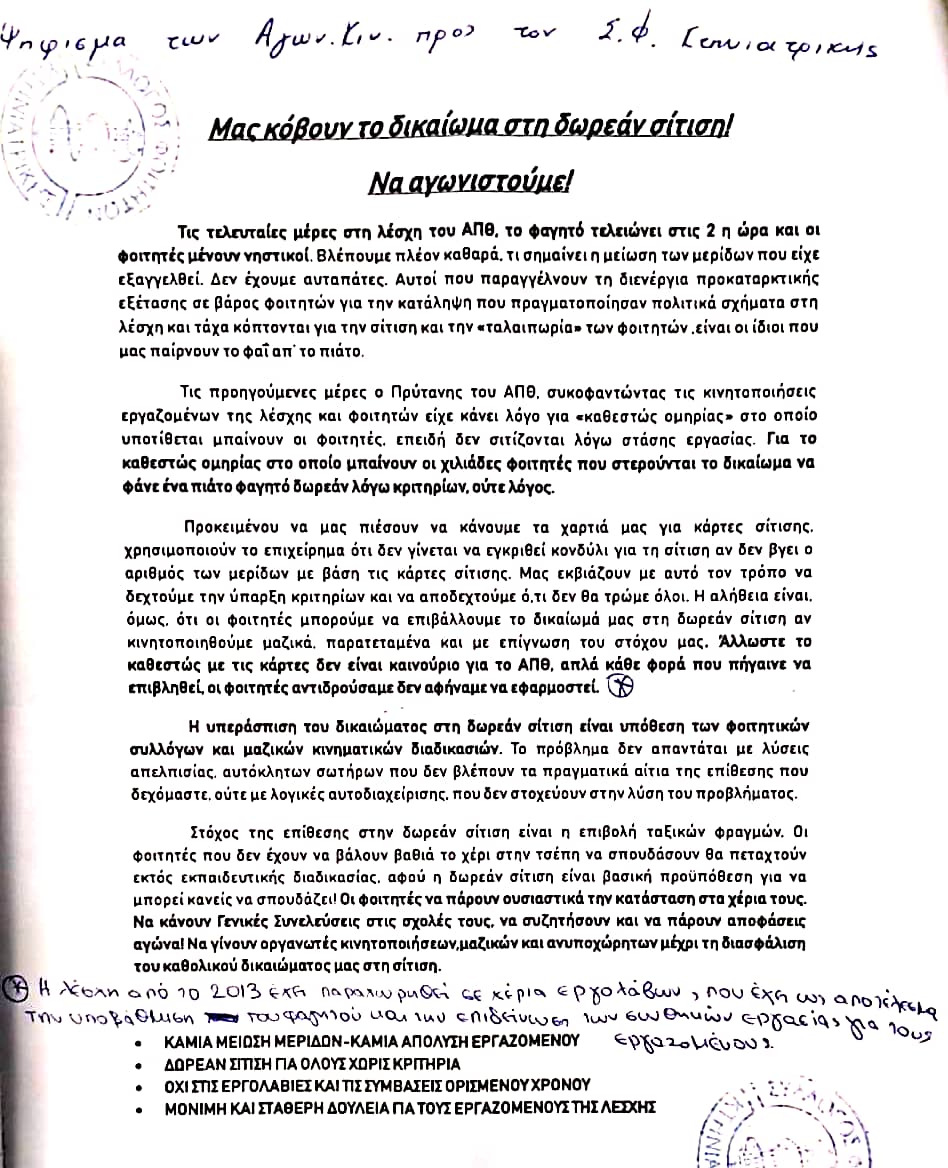 Τις προηγούμενες μέρες ο Πρύτανης του ΑΠΘ, συκοφαντώντας τις κινητοποιήσεις εργαζομένων της λέσχης και φοιτητών είχε κάνει λόγο για «καθεστώς ομηρίας» στο οποίο υποτίθεται μπαίνουν οι φοιτητές, επειδή δεν σιτίζονται λόγω στάσης εργασίας. Για το καθεστώς ομηρίας στο οποίο μπαίνουν οι χιλιάδες φοιτητές που στερούνται το δικαίωμα να φάνε ένα πιάτο φαγητό δωρεάν λόγω κριτηρίων, ούτε λόγος.
