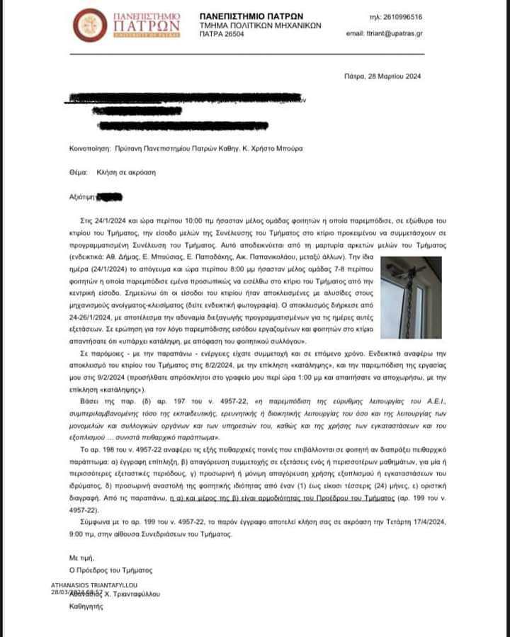Την Τετάρτη 28/3 ο πρόεδρος του τμήματος των Πολιτικών Μηχανικών Τριανταφύλλου έστειλε απειλητικά mail σε μέλη του Φοιτητικού Συλλόγου με κατηγορία τη συμμετοχή στις φοιτητικές καταλήψεις της περιόδου Γενάρη-Φλεβάρη. Συγκεκριμένα στοχοποιεί φοιτητές και φοιτήτριες οι οποίοι δεν άφησαν την προγραμματισμένη Συνέλευση Τμήματος να πραγματοποιηθεί και παρεμπόδισαν την είσοδό του στον χώρο της σχολής, ενώ παράλληλα τους κατηγορεί για τον αποκλεισμό των κτηρίων της σχολής που οδήγησε στην “αδυναμία διεξαγωγής των προγραμματισμένων […] εξετάσεων” (σε μια περίοδο που ο Φοιτητικός Σύλλογος είχε απόφαση Γενικής Συνέλευσης για κατάληψη). Στα εν λόγω mail ο πρόεδρος καλεί τους φοιτητές σε ακρόαση την Τετάρτη 17/4 και μάλιστα αναφέρεται έντονα στις πειθαρχικές διώξεις στις οποίες πρόκειται να υποβληθούν οι κληθέντες φοιτητές!
