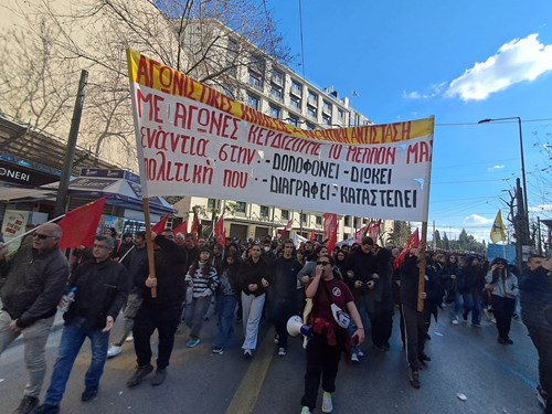 Πορευτήκαμε στο Σύνταγμα. Στη συγκέντρωση φωνάζαμε συνθήματα ενάντια στις πολιτικές του συστήματος, που διαρκώς δολοφονεί και στήνει παντού "νέα Τέμπη"