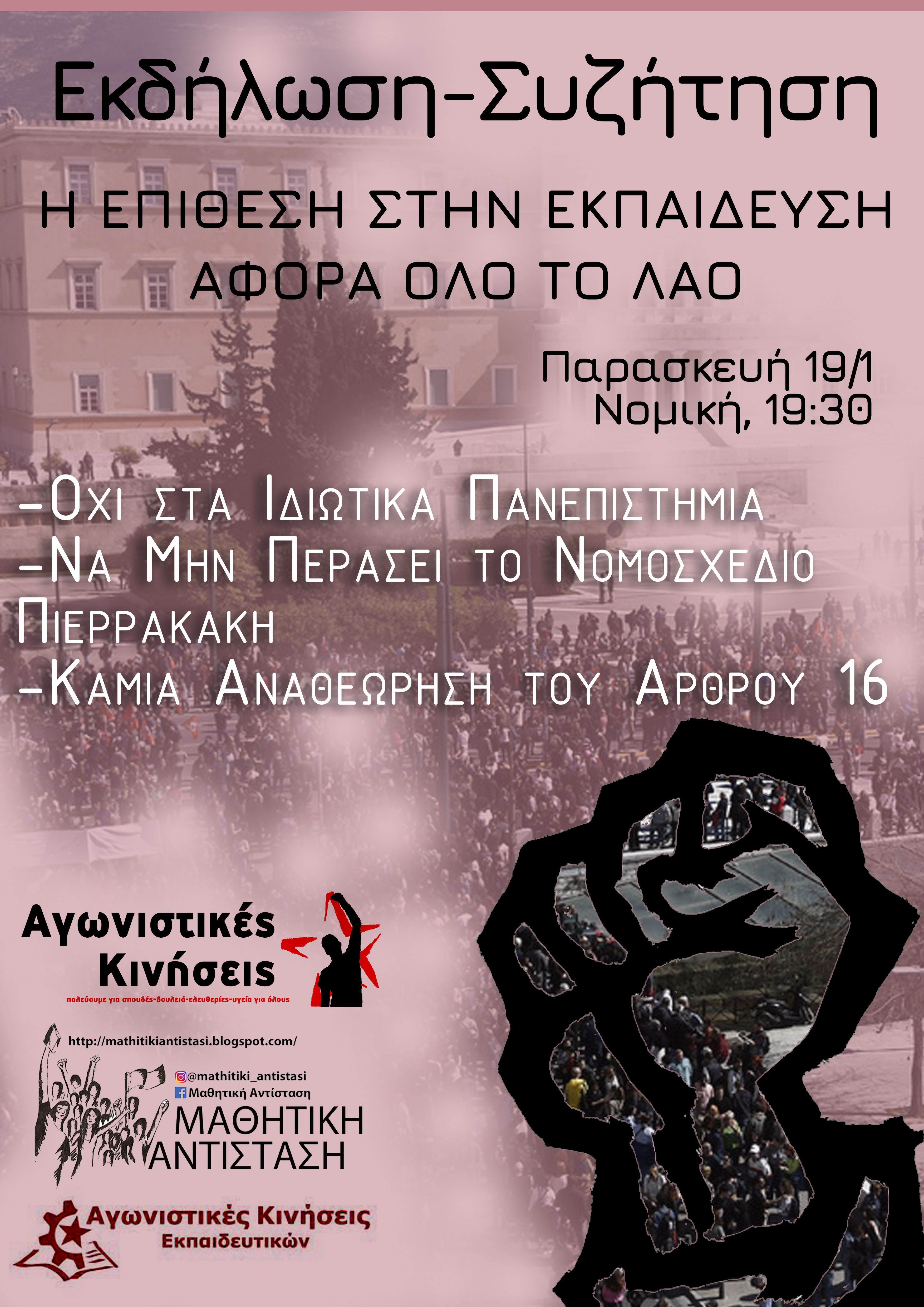Σας καλούμε να συζητήσουμε την Παρασκευή 19/1 στις 19:30 στη Νομική Σχολή Αθηνών (Σόλωνος) «Για την ομοβροντία των νόμων της κυβέρνησης ενάντια στη δωρεάν εκπαίδευση…»