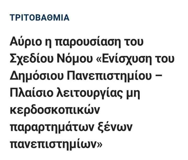 Αθήνα07 Φεβ 2024 ΑΘΗΝΑ | Όλοι αύριο στις 12:00 στο ΥΠΑΙΘ, Να μην κατατεθεί το ν/σ Πιερρακάκη Παρουσιάζεται αύριο το νομοσχέδιο Πιερρακάκη για τα ιδιωτικά πανεπιστήμια Καλούμε όλους τους φοιτητές και τις φοιτήτριες αύριο στις 12:00 στη συγκέντρωση στο υπουργείο παιδείας Η επίθεση στο δικαίωμά μας σε δημόσιες δωρεάν σπουδές δε θα περάσει. Το νομοσχέδιο για τα ιδιωτικά πανεπιστήμια δεν πρέπει να περάσει. ΌΧΙ στα ιδιωτικά πανεπιστήμια Δημόσιες δωρεάν σπουδές για όλους Πτυχία ενιαία με επαγγελματικά δικαιώματα