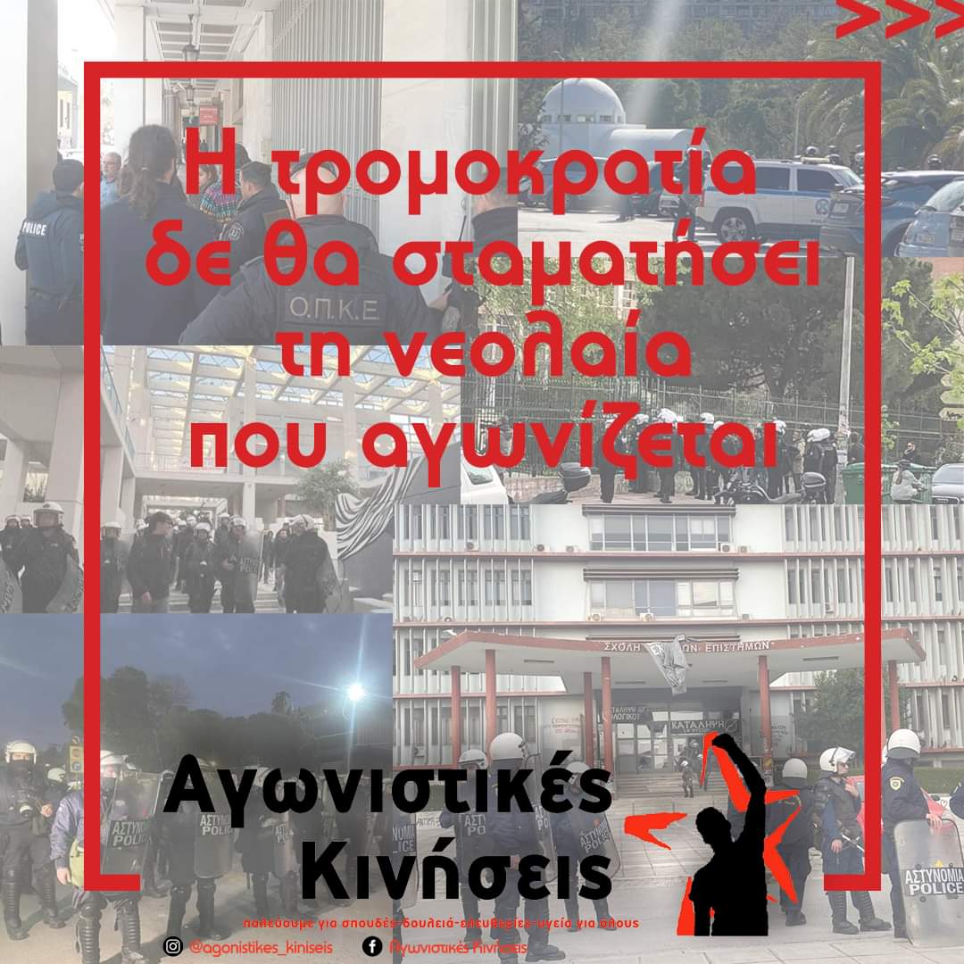 Η νεολαία, ωστόσο, βρίσκεται σε θέση να απαντάει δραστικά σε απειλές και τρομοκρατία. Το απέδειξε δραστικά κατά τη διάρκεια των καταλήψεων και συνεχίζει να το αποδεικνύει καταγγέλλοντας κάθε προσπάθεια επιβολής της κατασταλτικής πολιτικής. Είναι κρίσιμο να ξαναστραφούμε στις συλλογικές μας διαδικασίες, να μην επιτρέψουμε σε καμία κυβέρνηση να απλώνει χέρια στους φοιτητικούς αγώνες και τους συλλόγους μας. Να μαζικοποιήσουμε ξανά τις γενικές μας συνελεύσεις και να πάρουμε αποφάσεις αγώνα. Για να σπάσει η τρομοκρατία, μέχρι την ανατροπή του νόμου Πιερρακάκη