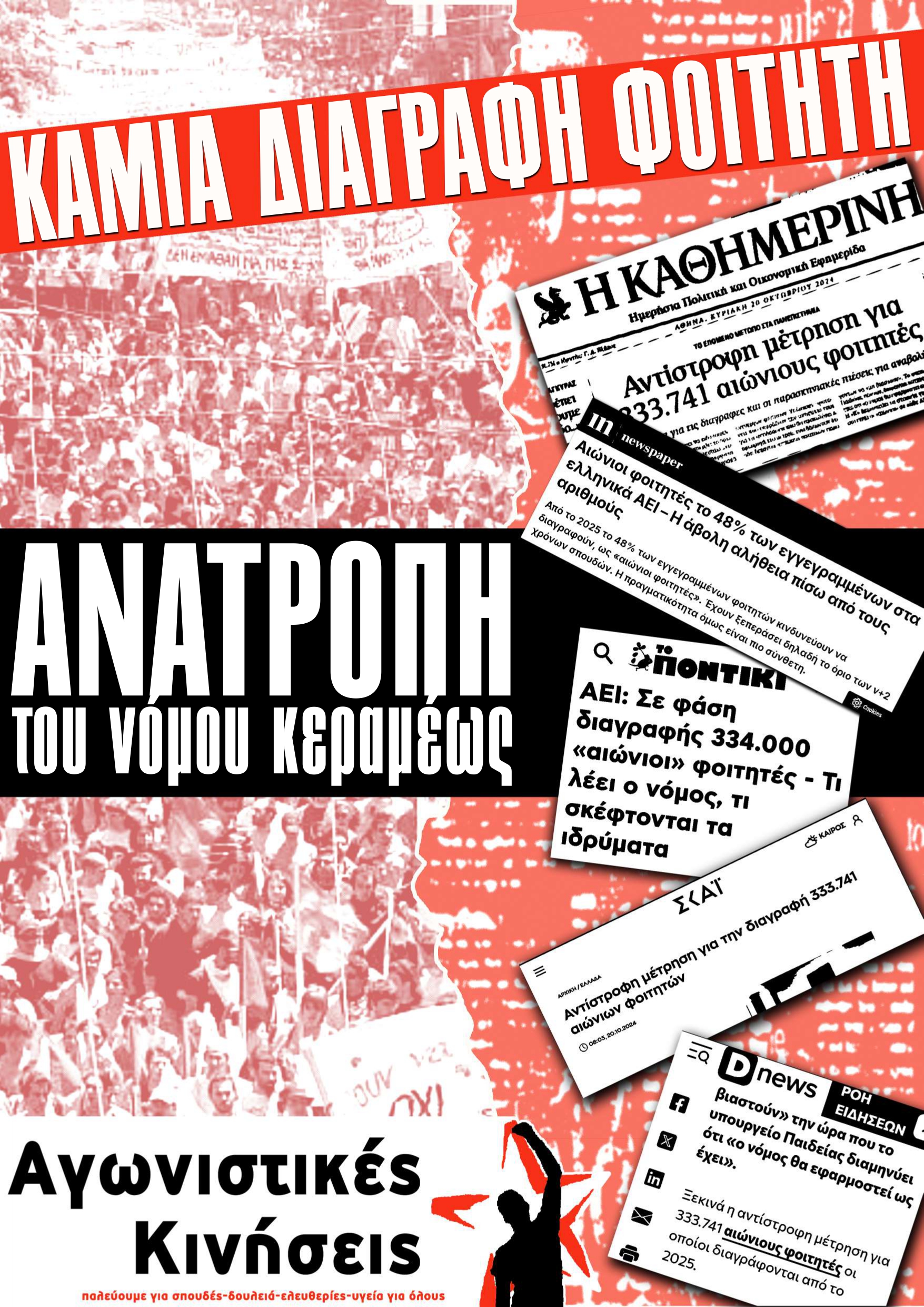 Ο μόνος τρόπος να τη «γλυτώσουμε» όμως, είναι η συγκρότηση φοιτητικού κινήματος που να πατάει στα πόδια του. Χωρίς αυταπάτες για καλούς πρυτάνεις και φιλολαϊκές κυβερνήσεις. Που να θέτει στο στόχαστρο συνολικά τον νόμο Κεραμέως και με αίτημα την ΑΝΑΤΡΟΠΗ του. Με συνελεύσεις και κινητοποιήσεις σε κάθε σύλλογο. Μόνο έτσι θα εξασφαλίσουμε ότι κανένας μας δεν θα διαγραφεί. Μόνο έτσι θα κερδίσουμε το οξυγόνο μας. Οι μεγαλειώδεις κινητοποιήσεις του προηγούμενου διαστήματος πρέπει να συνεχιστούν. Να παλέψουμε για δικαιώματα στη ζωή μας, στους χώρους που δουλεύουμε, που σπουδάζουμε, που υπάρχουμε καθημερινά. Αυτή θα είναι η πραγματική «δικαίωση» για τα θύματα και η πραγματική ήττα για το σύστημα που δολοφονεί τις ζωές μας. Να μην αφήσουμε κανέναν να διοχετεύσει την οργή μας στα κοινοβουλευτικά τους παιχνίδια. Τα δικαιώματά μας κερδίζονται στους δρόμους!