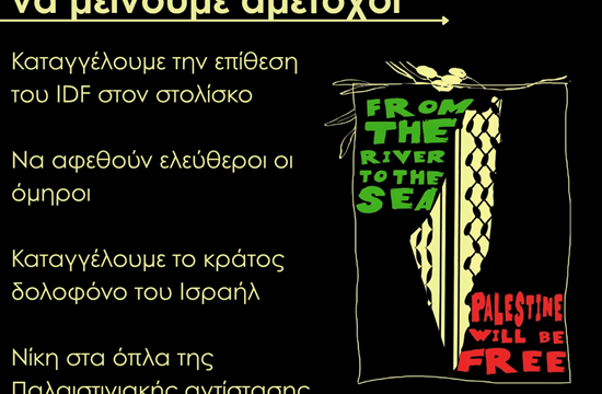 Εδώ και δύο χρόνια σφαγιάζεται ο παλαιστινιακός λαός μπροστά στα μάτια όλου του κόσμου. Όλοι ως μάρτυρες αυτής της γενοκτονίας που συντελείται αυτή την στιγμή καλούμαστε να καταγγείλουμε το σιωνιστικό κράτος τρομοκράτη του...