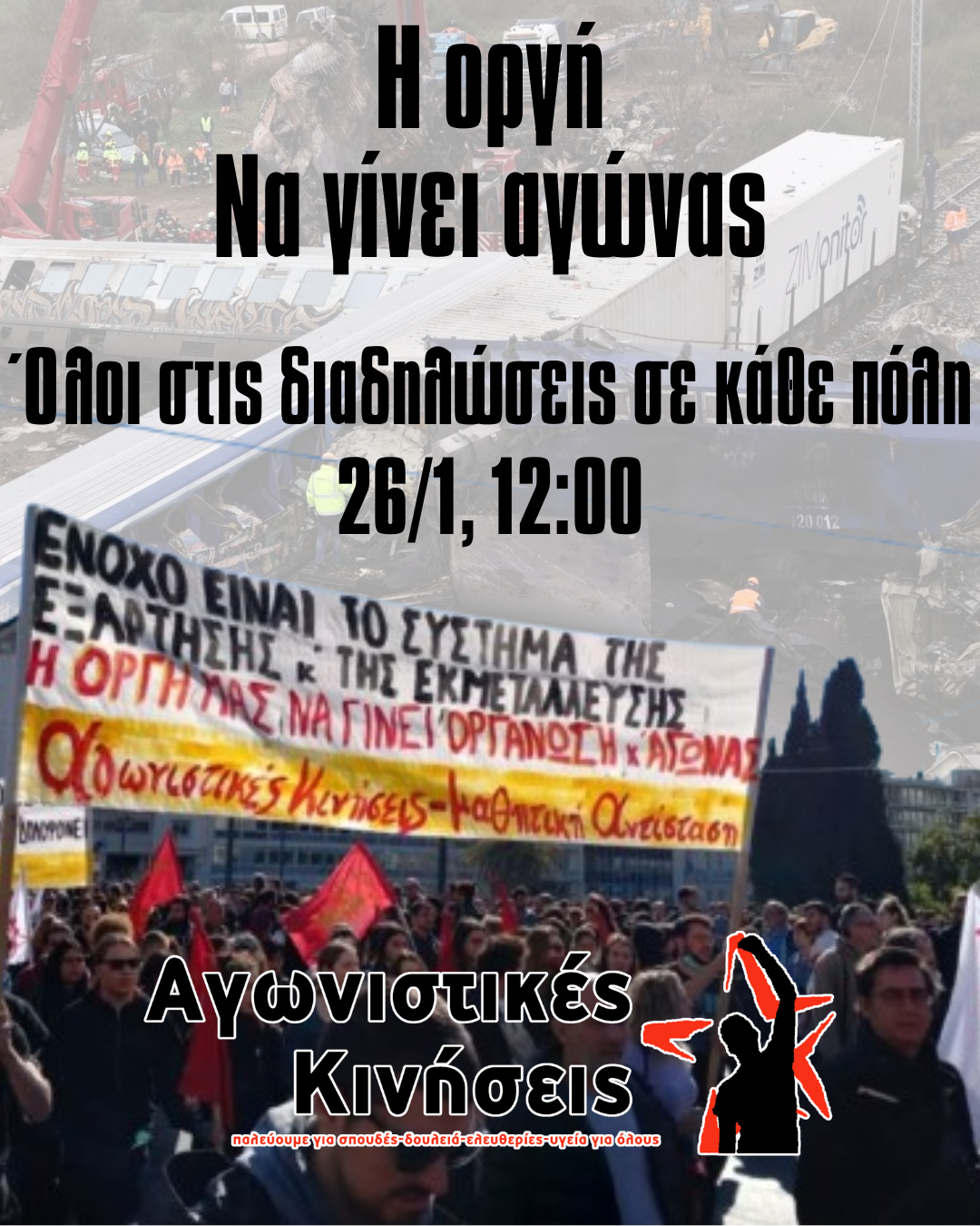 Δεν περιμένουμε καμία σωτήρια κυβέρνηση, κανένα αστικό δικαστήριο να αποδώσει δικαιοσύνη. Οι φοιτητές μαζί με το λαό να βάλουμε φραγμό στην πολιτική που μας βλέπει αναλώσιμους. Στο δρόμο που χαράσσουν οι φοιτητές στη Σερβία, που εδώ και τρεις μήνες βρίσκονται στο δρόμο με αφορμή και αιτία τον θάνατο 15 ατόμων στο σιδηροδρομικό σταθμό Νόβι Σαντ και καταγγέλλοντας συνολικά τη δολοφονική πολιτική που για άλλη μια φορά μέτρησε θύματα. Να καταγγείλουμε τη δολοφονία των Τεμπών και να διεκδικήσουμε ζωή με δικαιώματα.